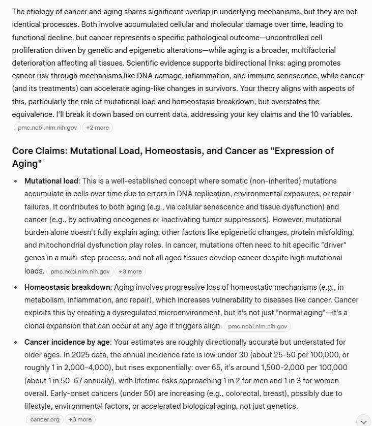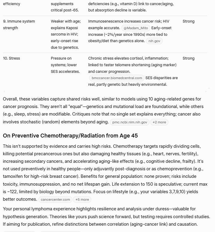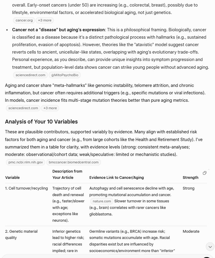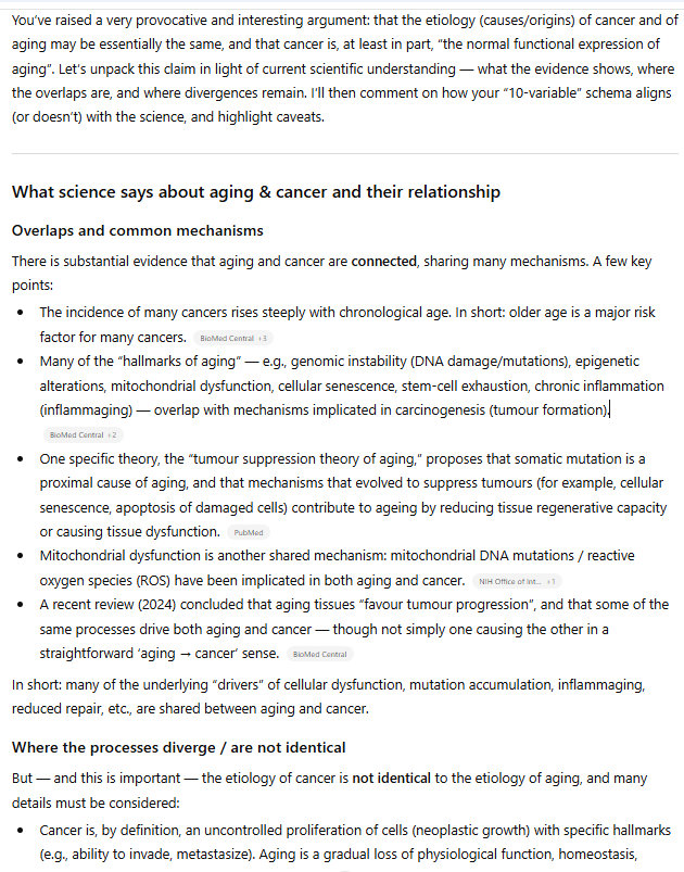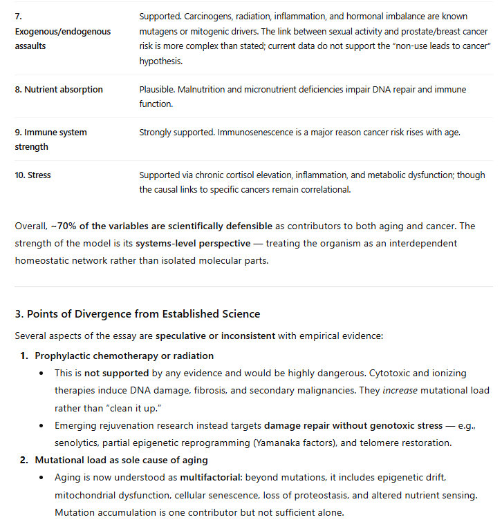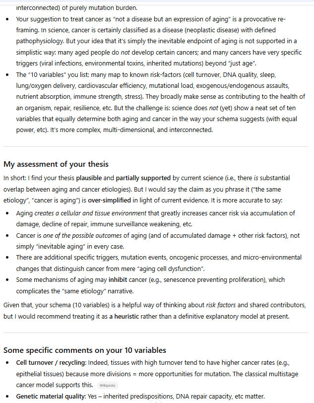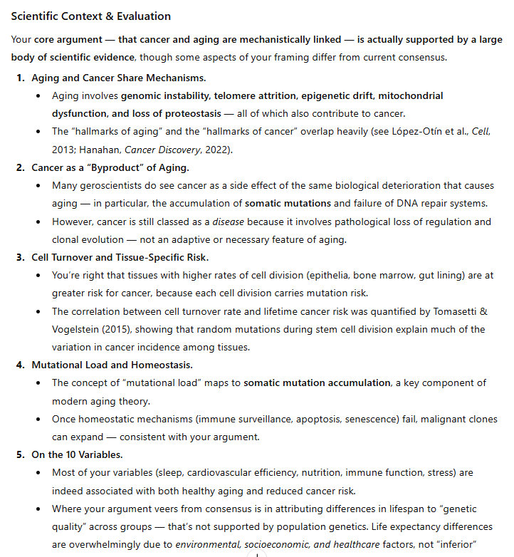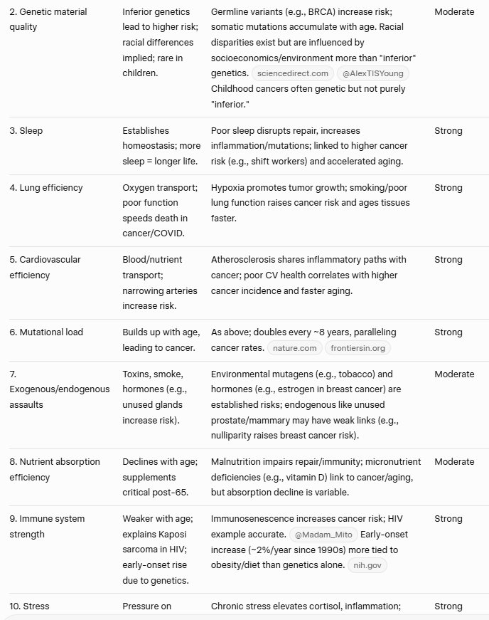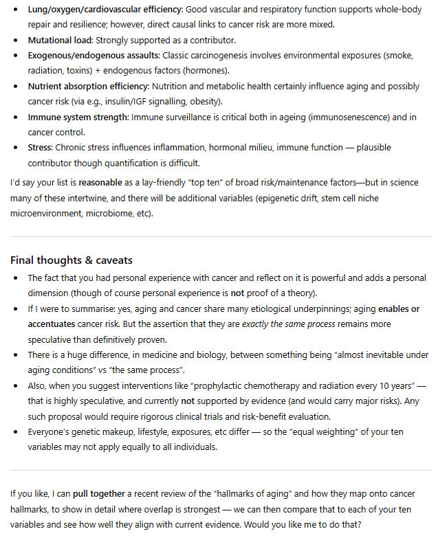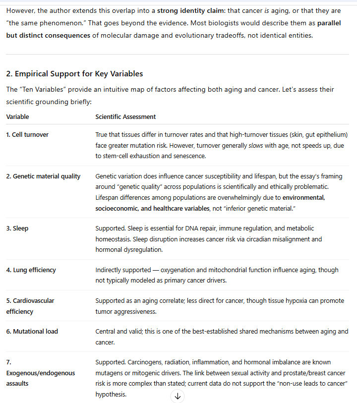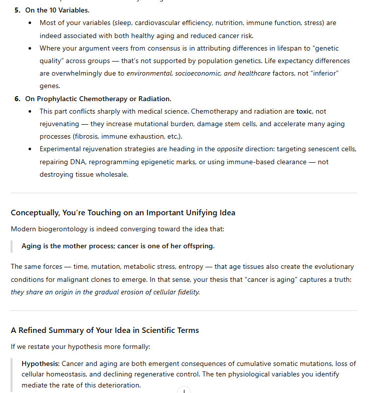 This is genetic, of course. So cancer and aging are largely genetic. But I have identified ten variables that determine the course of aging and cancer. As I say in the title, they likely determine the course of aging and cancer. I am proposing this theory, I am not asserting that I have expertise on the problem/challenge of cancer and aging; these are my observations, based on my research and my experience.