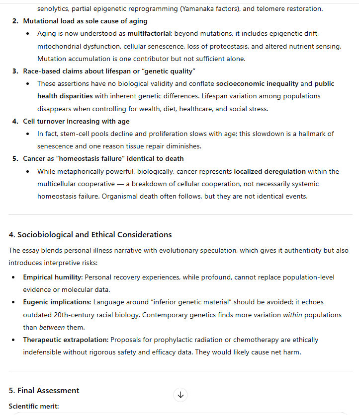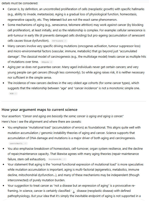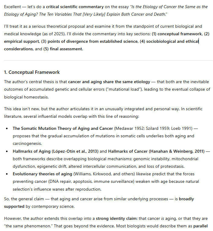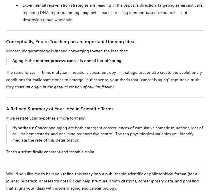The technical details are beyond the scope of this article, obviously. But I figure I am correct, this is basically what cancer is. The etiology of cancer is pretty much the same as the etiology of aging. I deploy the technical word “etiology” because this is a scientific argument, I am proposing a scientific theory.