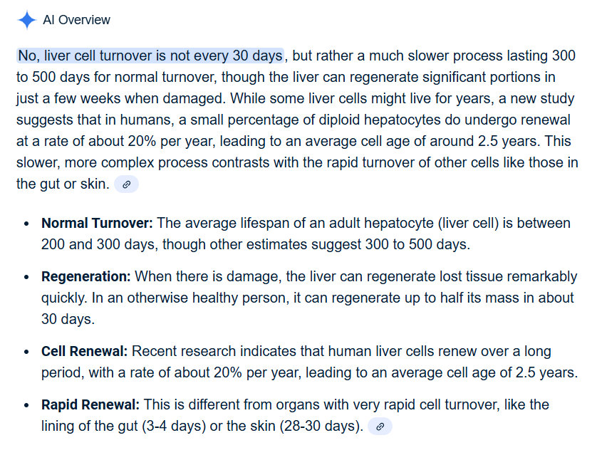 1+ cell turnover, cell recycling, the trajectory of this recycling process. All cells in the body and brain – with the exception of neurons, apparently – recycle and turnover, they die and then renew themselves. This gives life, of course. In fact, I can quote my oncologist, a graduate of a major medical school in the United States. He and I had a discussion about this in his office, during one of my visits with him. “It's amazing that more things don't go wrong with the recycling process, so it is genetic, they are 'mishaps' that happen in the genetically-driven cell recycling process." I had the impression that the recycling speeds up as you age, but this might not be true, it might be slowing down. This is not clear, the reality. It makes sense to me that, as you age, this cell turnover increases in speed. So, a liver is recycled every month or so. Every month you basically have a new liver. With the lungs it is up to 1.5 years or 2 years. You will have new lungs. Endothelial cells turnover as well, all cells do as I said, except neurons.