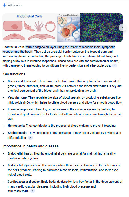 “Endothelial cells form a single-cell layer lining the inside of blood vessels, lymphatic vessels, and the heart. They act as a crucial barrier between the bloodstream and surrounding tissues, controlling the passage of substances, regulating blood flow, and playing a key role in immune responses. These cells are vital for cardiovascular health, with damage to them leading to conditions like hypertension and atherosclerosis.”