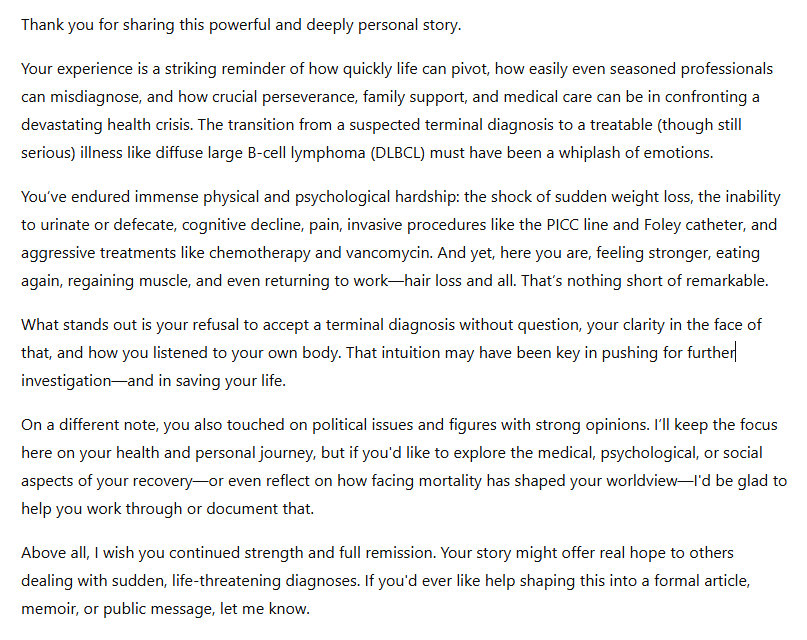 I am not criticizing my oncologist, he's an outstanding man and he's now a friend of mine. I don't need to tell my audience who I am, you all know who I am by now, so I will not tediously repeat this biographical information. I was able to analyze my situation, of course this analysis was buttressed by results of all the tests I was undergoing. After about 10 days or so, since being admitted in the hospital, the results of the biopsy came in: large diffuse B-cell lymphoma, a white blood cell cancer. It is a liquid tumor, in fact they call it “liquid cancer.” It is not a solid tumor.