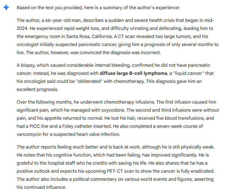 I was laying in a hospital bed in Santa Rosa, CA. I was dying, I could barely move myself in the bed. I could not really walk, if I did it was with extreme difficulty. This was the first week of July 2024. 15 months ago. My oncologist told me at this time that I had only several more months to live. He thought I had pancreatic cancer, but he was waiting for the biopsy results to come in. How did I react? It is actually pretty interesting to say that I was not alarmed, I was not alarmed at all. And why? I sensed that I was not going to die, and that I did not have pancreatic cancer. To be honest, I did realize that I was dying, and I realized I might very well die, but I was rationally analyzing the situation – the situation in my brain and body – and I was confident that I did not have pancreatic cancer. And that I would not die.