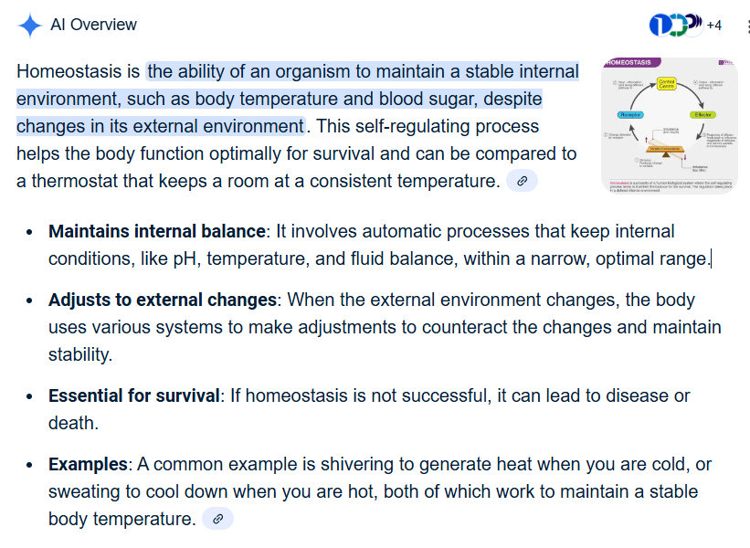 “Homeostasis is the ability of an organism to maintain a stable internal environment, such as body temperature and blood sugar, despite changes in its external environment. This self-regulating process helps the body function optimally for survival and can be compared to a thermostat that keeps a room at a consistent temperature.”