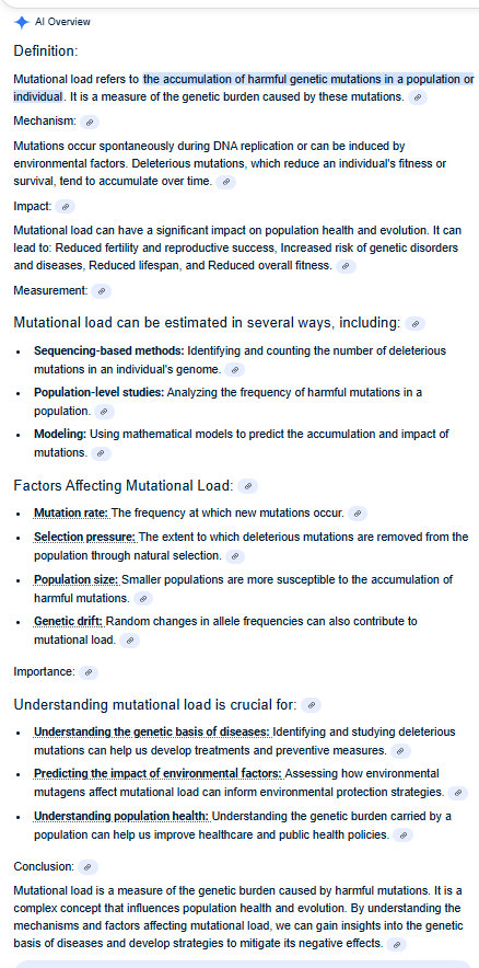 Mutational load can have a significant impact on population health and evolution. It can lead to: Reduced fertility and reproductive success, Increased risk of genetic disorders and diseases, Reduced lifespan, and Reduced overall fitness.”
