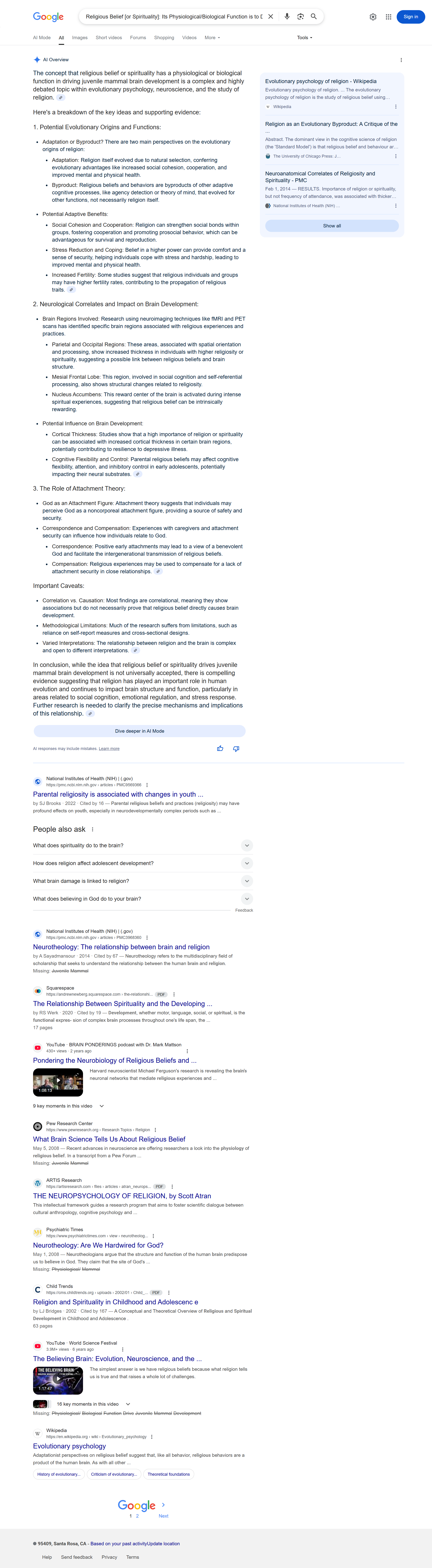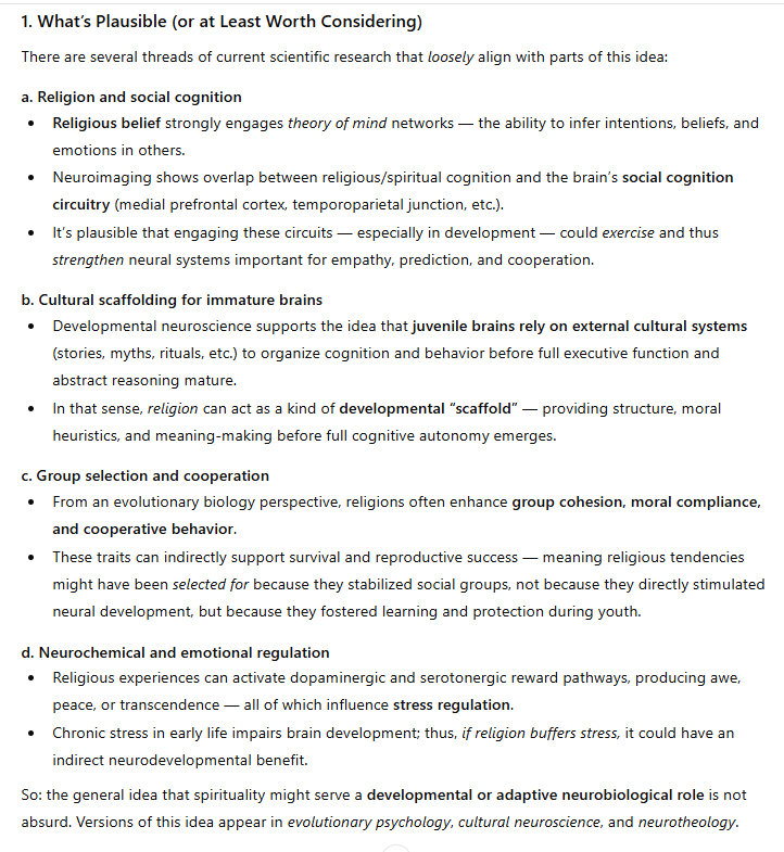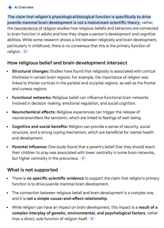 The physiological/biological function of religious belief [or call it spirituality] in the human brain is to drive juvenile mammal brain development.