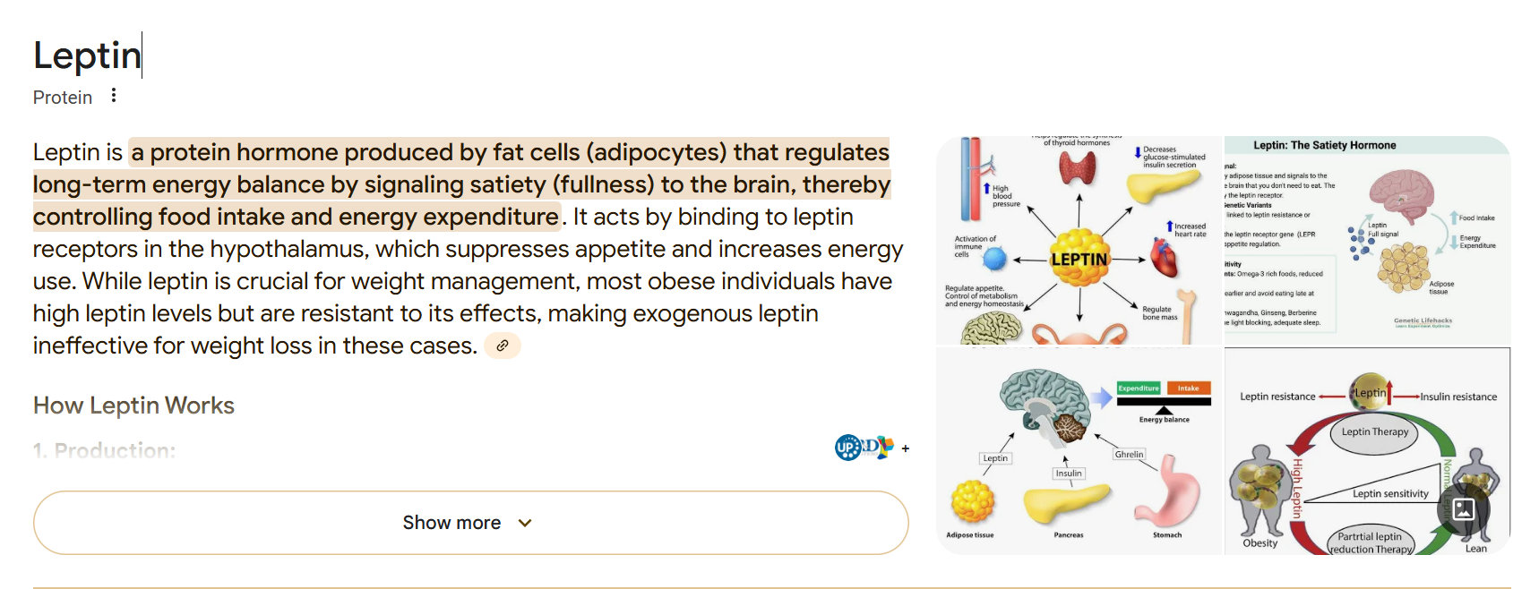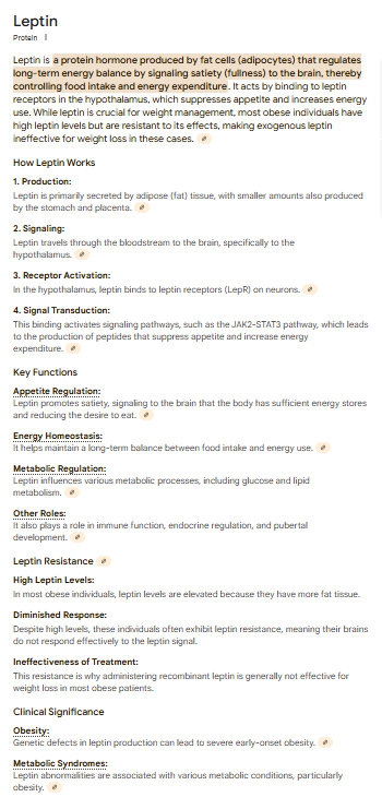 “Leptin is a protein hormone produced by fat cells (adipocytes) that regulates long-term energy balance by signaling satiety (fullness) to the brain, thereby controlling food intake and energy expenditure. It acts by binding to leptin receptors in the hypothalamus, which suppresses appetite and increases energy use. While leptin is crucial for weight management, most obese individuals have high leptin levels but are resistant to its effects, making exogenous leptin ineffective for weight loss in these cases.”