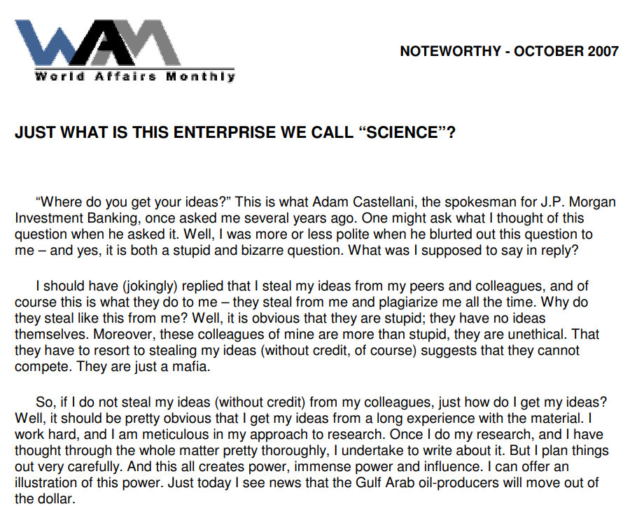 I don't remember much about this conversation, as I said. But I do recall that he was really puzzled and certainly amazed by his interaction with me, by World Affairs Monthly. This is what I wrote in October 2007: