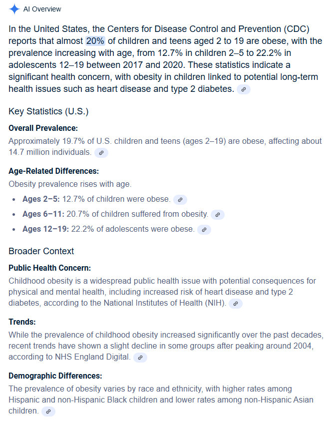 "In the United States, the Centers for Disease Control and Prevention (CDC) reports that almost 20% of children and teens aged 2 to 19 are obese, with the prevalence increasing with age, from 12.7% in children 2–5 to 22.2% in adolescents 12–19 between 2017 and 2020. These statistics indicate a significant health concern, with obesity in children linked to potential long-term health issues such as heart disease and type 2 diabetes."