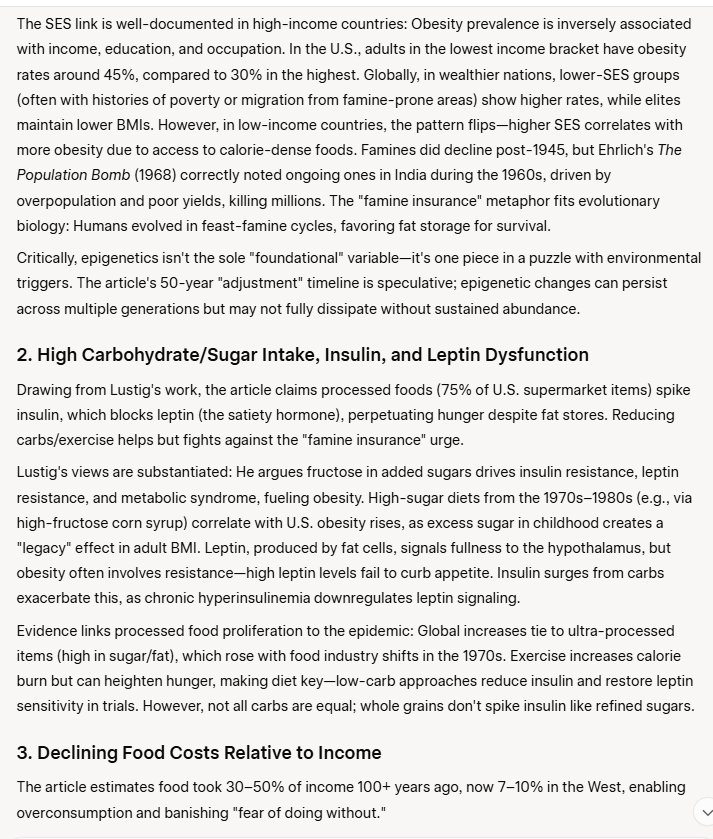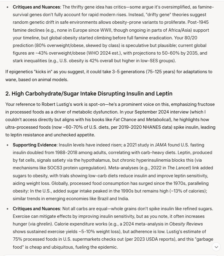2+ the second variable is what my friend Robert H. Lustig MD [neuroendocrinologist at University of California, San Francisco, professor emeritus of pediatrics] identified. According to him, this is what's going on in the human body, and I am confident he is right. I did an interview with Lustig on Sep 12, 2024. Published at bottleneckanimal.com. If I remember correctly, I think he said that a high carbohydrate and sugar intake is the norm in the Western world, in the United States in particular. He told me that 75% of the food in your typical American supermarket is processed food. What happens is that this sugar [carbohydrate] raises the insulin levels in the blood. He told me that insulin levels are about double the level they were in 1980. These high insulin levels in the blood act to disable the hormone leptin, and leptin is what acts in the brain to shut down appetite.