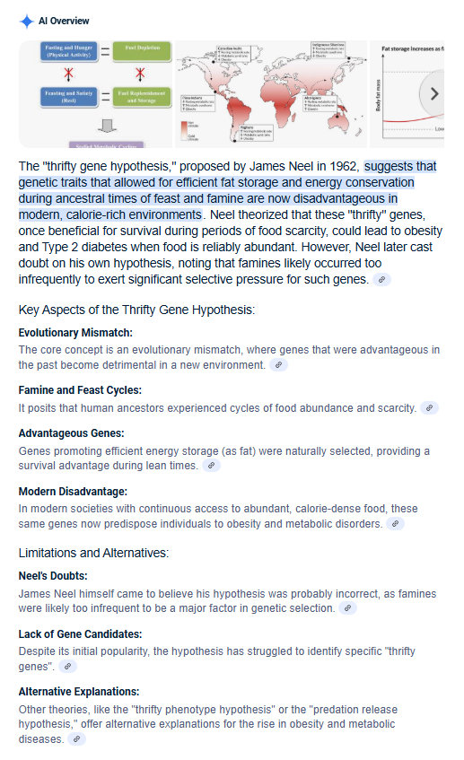 1+ you might say that this is the human mammal's “famine insurance” and that this insurance is taken out by calling on the genome. It is epigenetic, meaning that if 50 years go by and there are no famines – where huge numbers die of starvation – then the genetic material would adjust for that new development and the need to “take out famine insurance” would diminish, if not go away entirely. You fill up your tank, you might say. Fat is stored, for a rainy day, to use a silly expression. And it is not just a little fat, it is a major fat storage operation. Maybe 30% of your body weight would be in fat. Then there are the “overweight” human mammals. They are less fat, but they are still fat. I would argue that these overweight human mammals come from the lower socioeconomic levels of society. They were peasants and workers, low status individuals. Their insurance had to be there, otherwise they would likely die in a famine. And famines were relatively common, in history. Not until after 1945 did famines begin to diminish in number and intensity. And Paul Ehrlich noted that there were still famines in India in the 1960s. So he wrote his book on the population bomb.