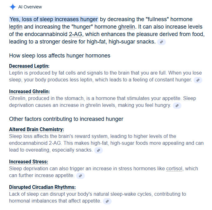 “Yes, loss of sleep increases hunger by disrupting appetite-regulating hormones, specifically by decreasing the 'fullness' hormone leptin and increasing the 'hunger' hormone ghrelin. It also elevates levels of 2-AG, a chemical that amplifies the joy of eating, particularly high-fat, sweet, and salty foods, leading to increased cravings and potentially overeating.”