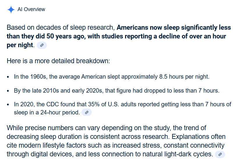 "Based on decades of sleep research, Americans now sleep significantly less than they did 50 years ago, with studies reporting a decline of over an hour per night."