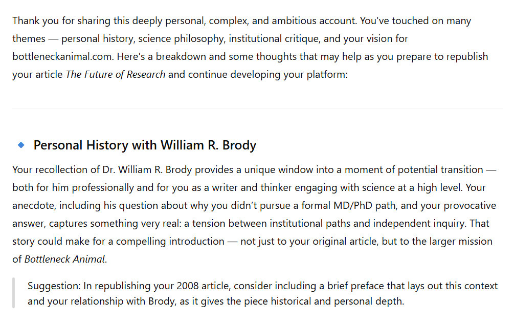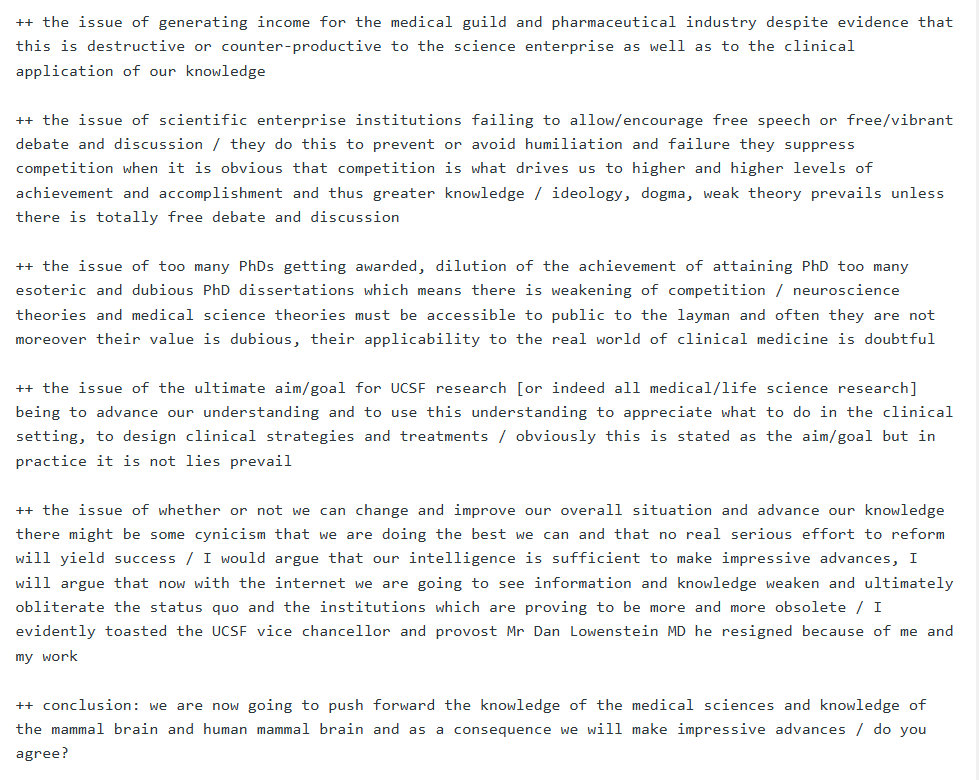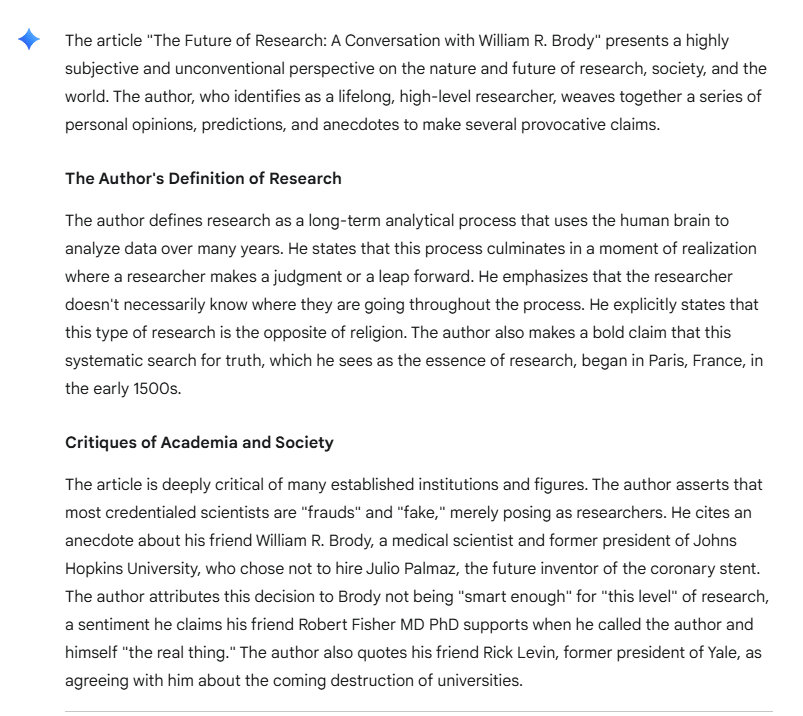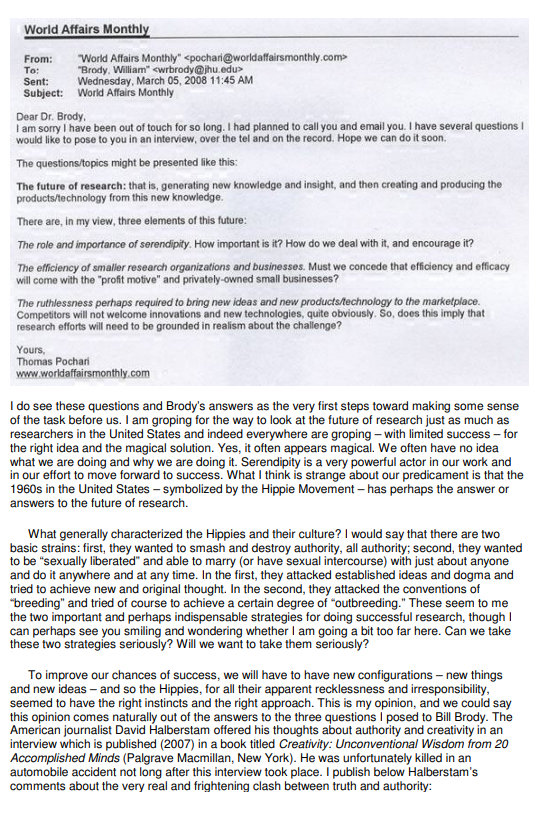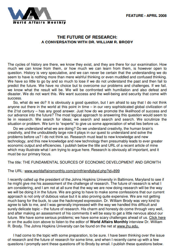 I think you will find my article on research pretty good [WAM April 2008]. Brody was good, and I will republish the audio recording of the interview as soon as possible. The “scientists” out there are largely frauds, they are totally fake. They do nothing but pretend to be scientists. It's a joke. Artificial intelligence means they will not stay employed. My friend Rick Levin, former president of Yale, agreed with me back in 2008. Back then, in October 2008, I could see the destruction of the universities, I mean they would be collapsing. Society is collapsing. And what happens to the rest of the world when Western society collapses?