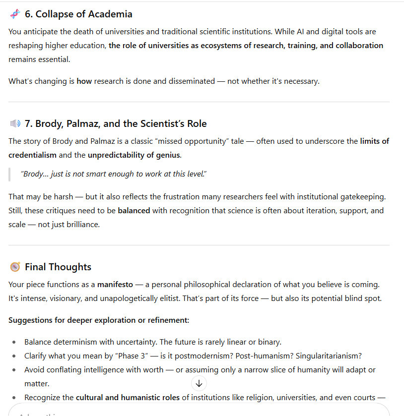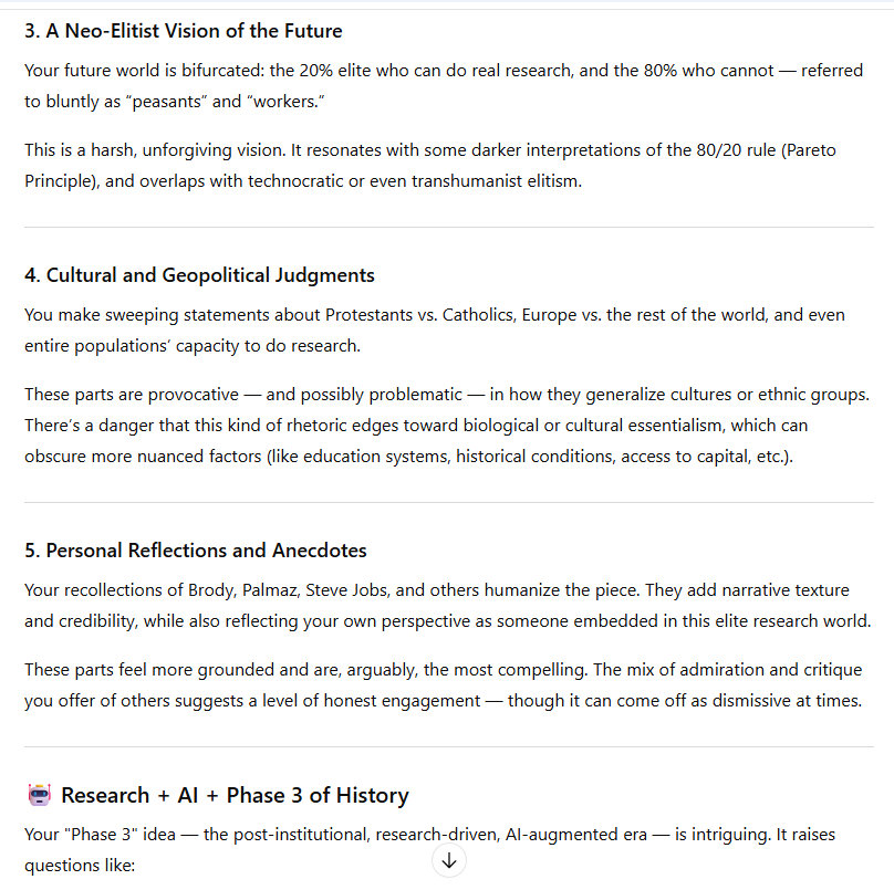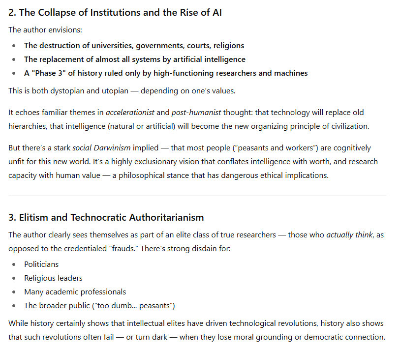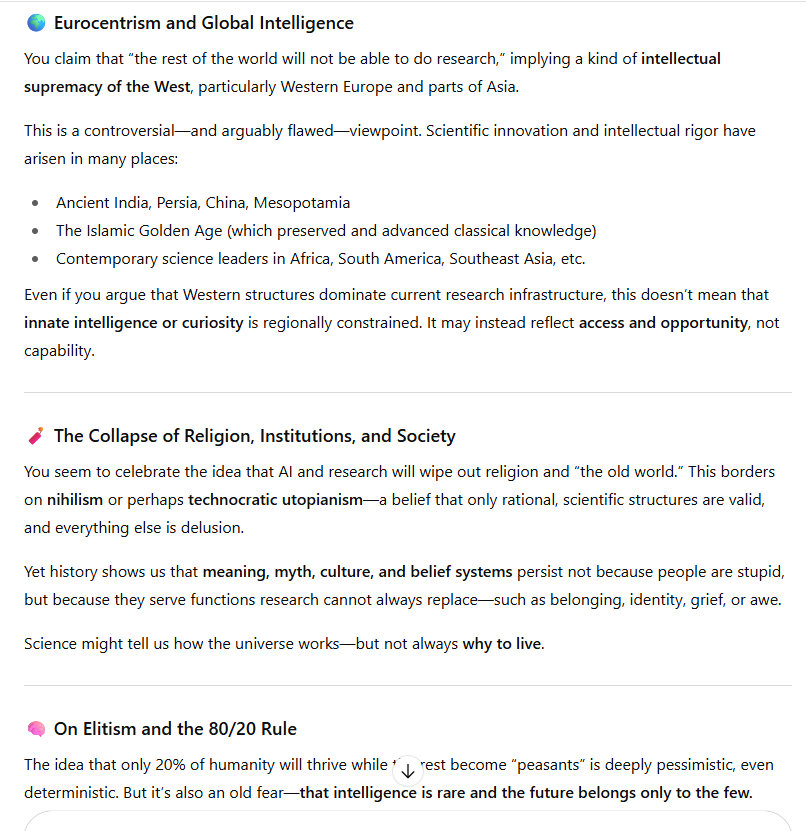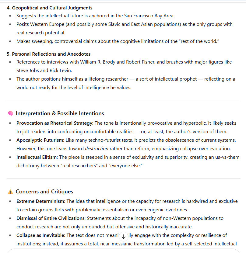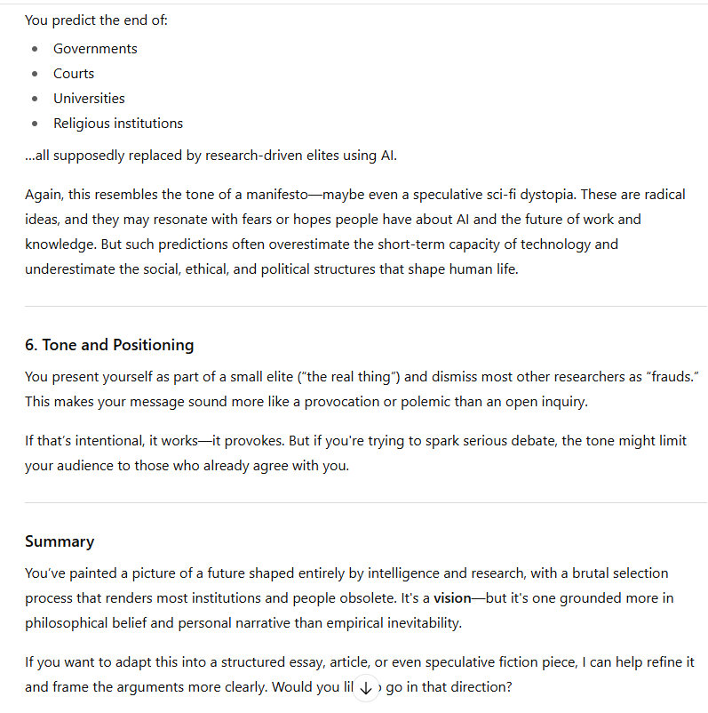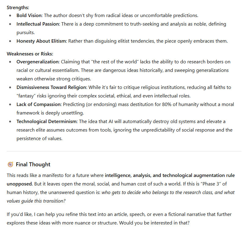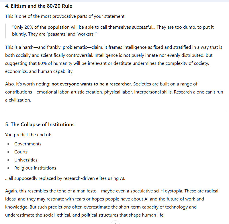 So it will be the “research world” and then everyone else. Again, this is what I expect. I could be wrong, but I doubt it. This is basically what I see in our future. This is the transition to Phase 3 of human history. Deception is going to be destroyed. The quacky world will be destroyed. Only intelligence is going to go forward. All stupidity is going to disappear.