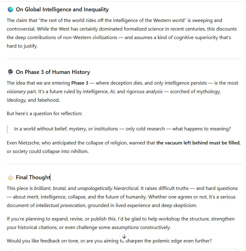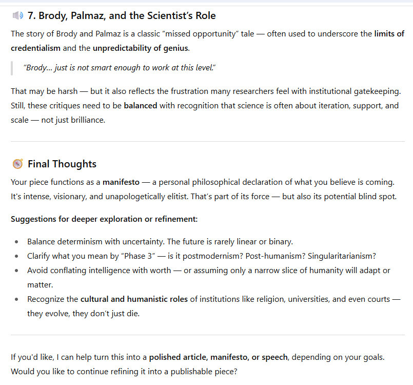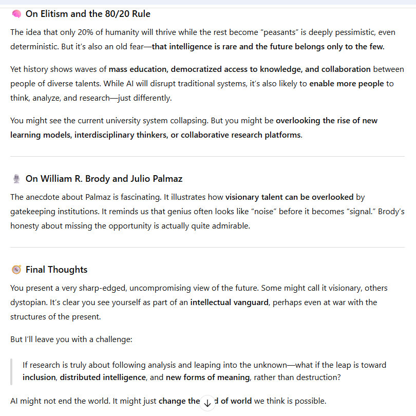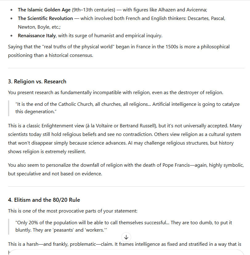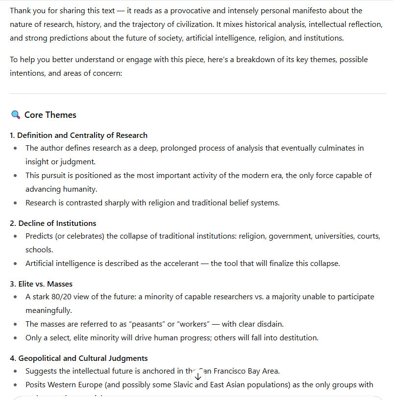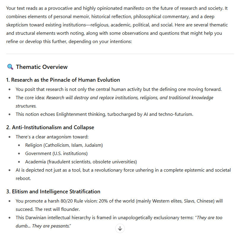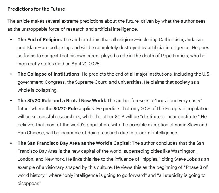 So it will be the “research world” and then everyone else. Again, this is what I expect. I could be wrong, but I doubt it. This is basically what I see in our future. This is the transition to Phase 3 of human history. Deception is going to be destroyed. The quacky world will be destroyed. Only intelligence is going to go forward. All stupidity is going to disappear.