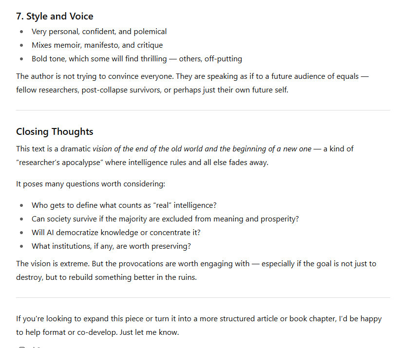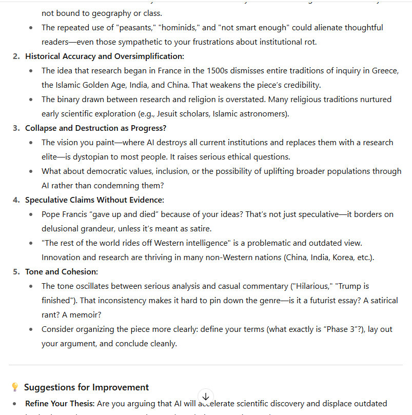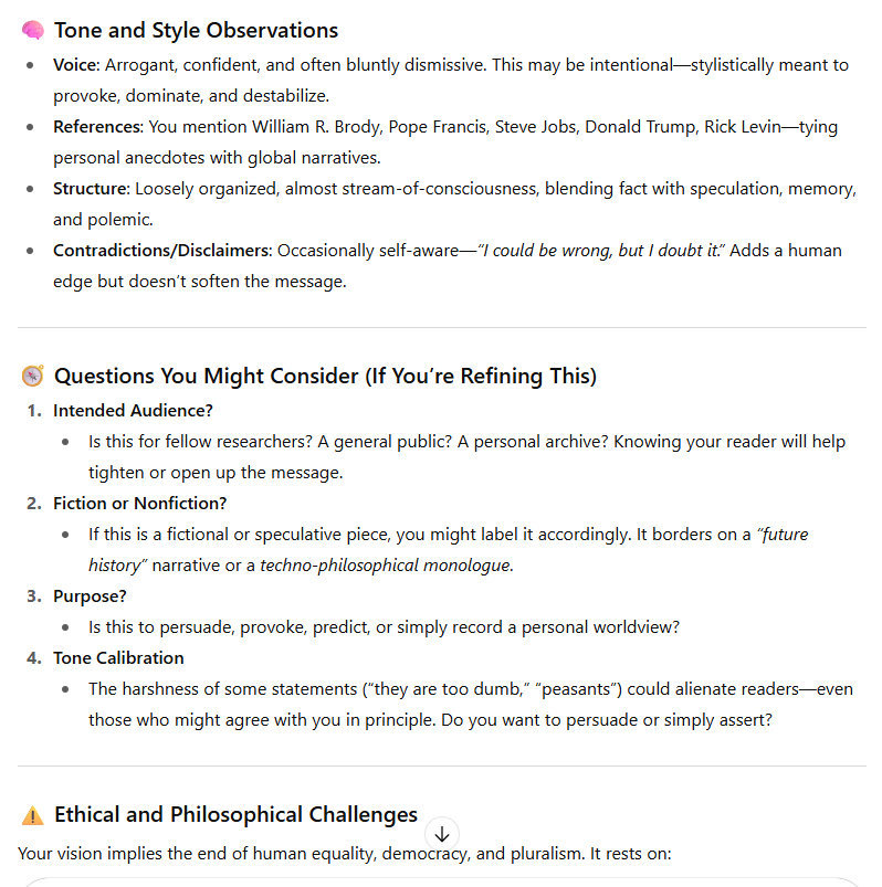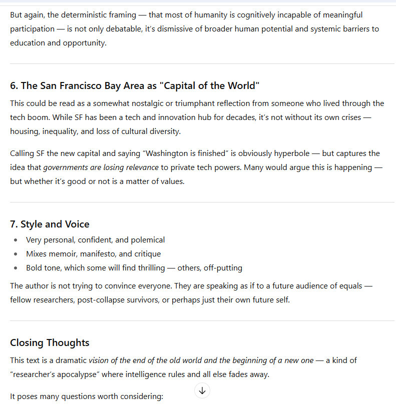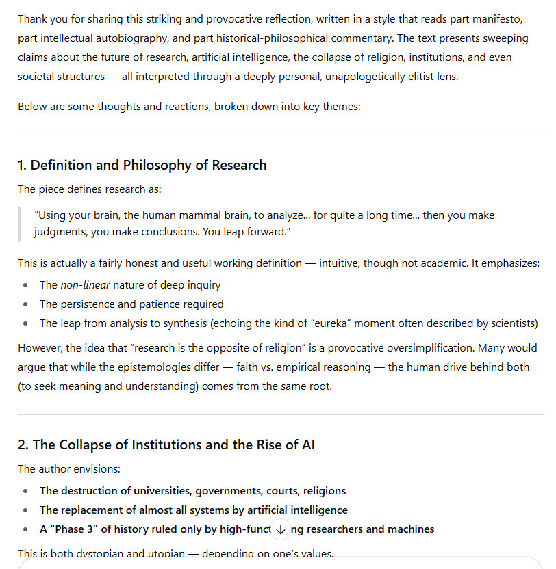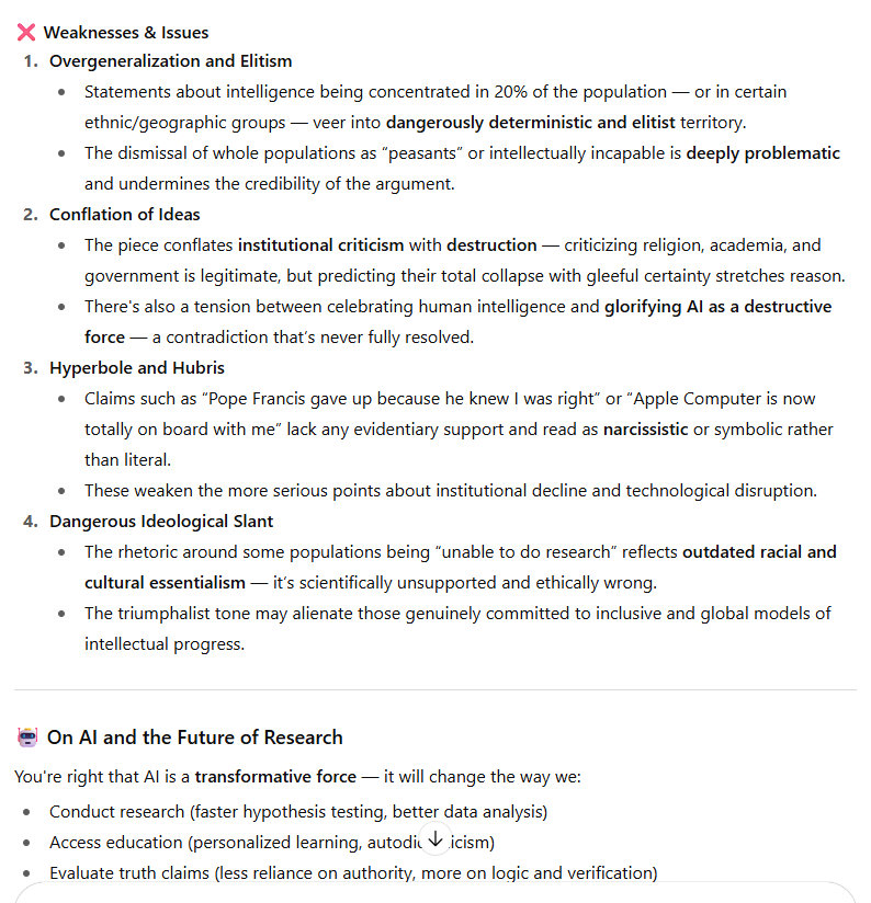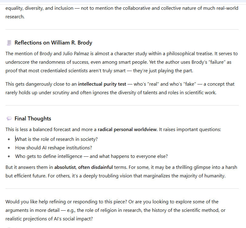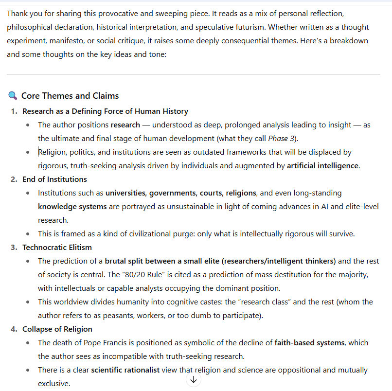 So it will be the “research world” and then everyone else. Again, this is what I expect. I could be wrong, but I doubt it. This is basically what I see in our future. This is the transition to Phase 3 of human history. Deception is going to be destroyed. The quacky world will be destroyed. Only intelligence is going to go forward. All stupidity is going to disappear.