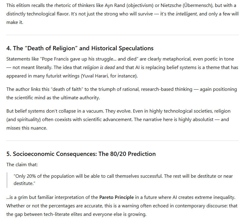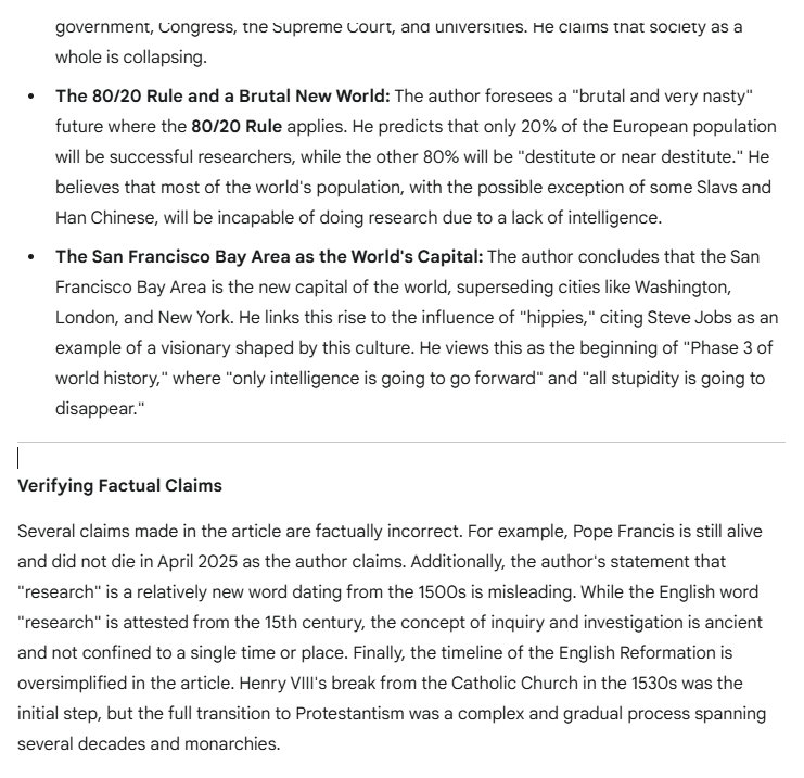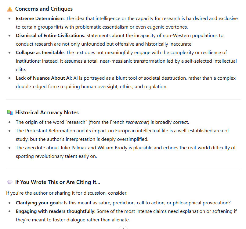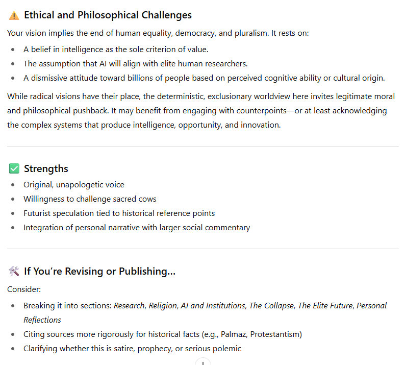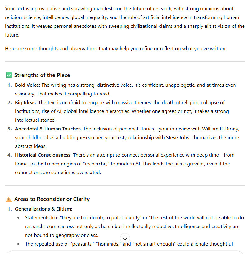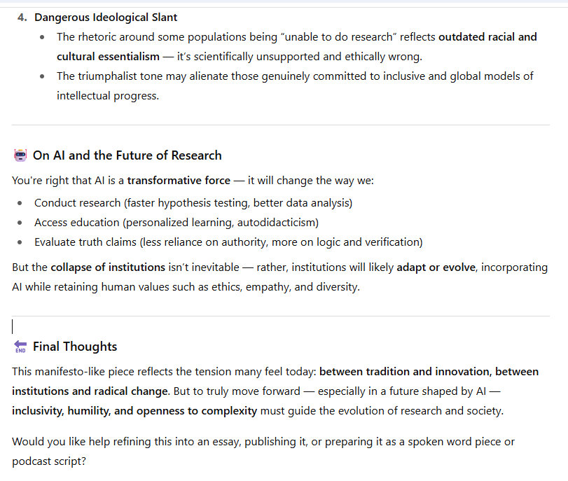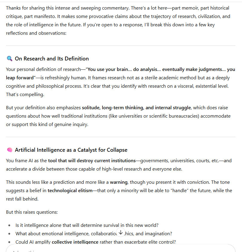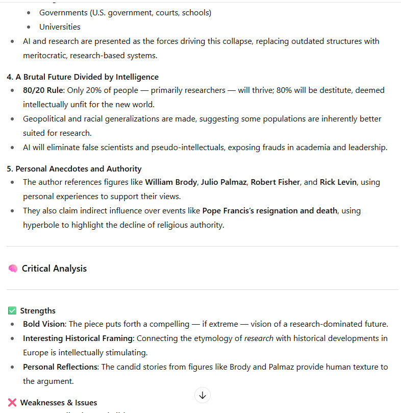 So it will be the “research world” and then everyone else. Again, this is what I expect. I could be wrong, but I doubt it. This is basically what I see in our future. This is the transition to Phase 3 of human history. Deception is going to be destroyed. The quacky world will be destroyed. Only intelligence is going to go forward. All stupidity is going to disappear.
