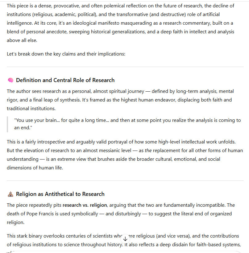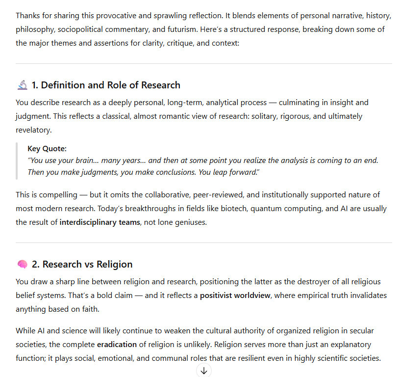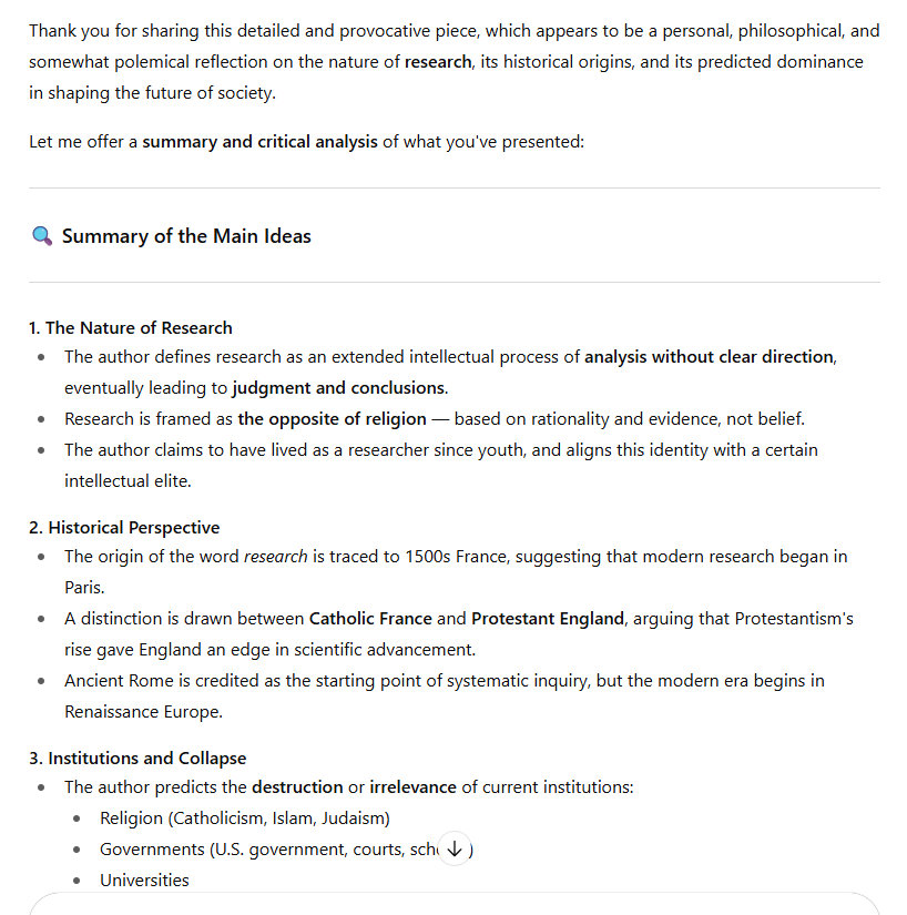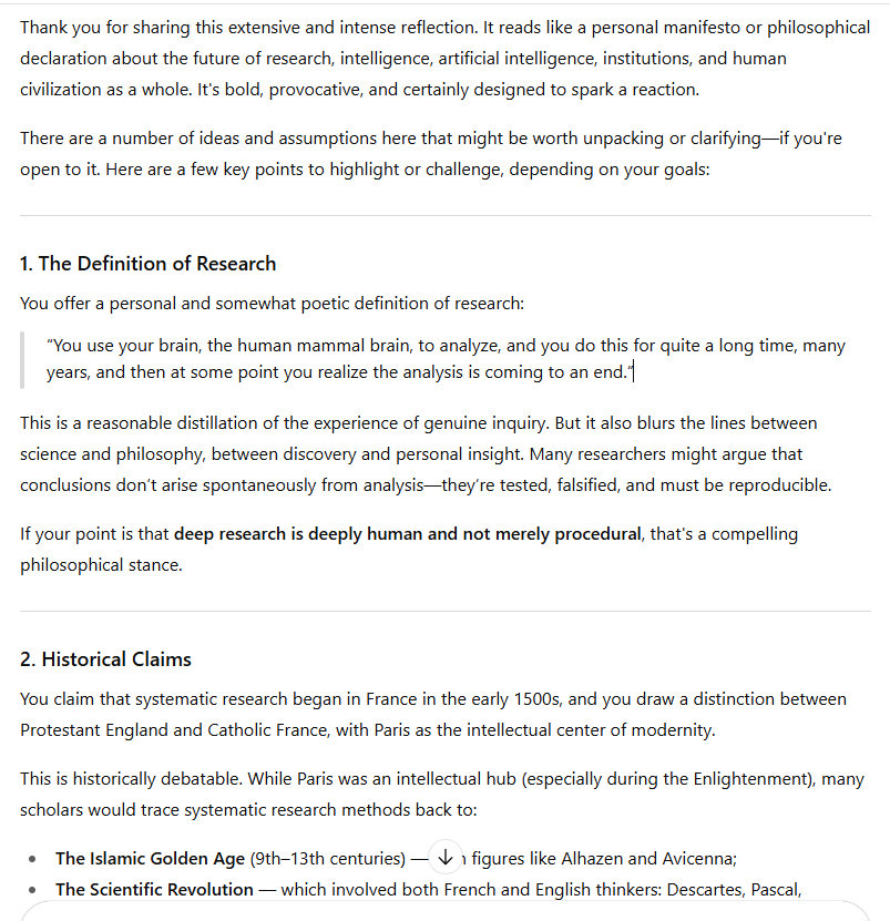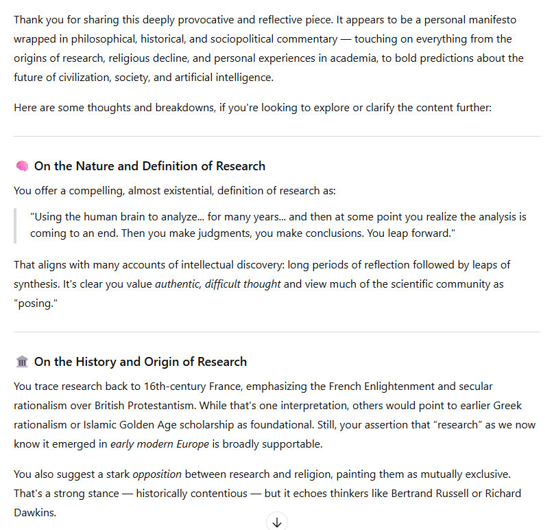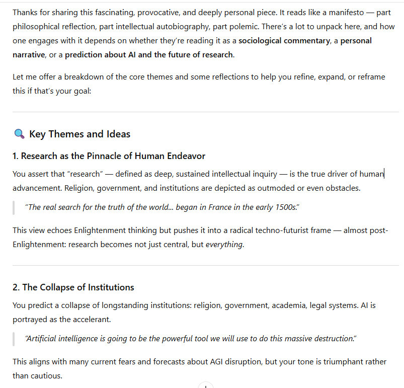 We are entering the period of history, human history, where research is going to really kick ass. Research will destroy the world we now have – all institutions, all religions, all (or most) knowledge. It is the end of the US government, the end of the US Congress, the Supreme Court, the end of the White House – etc. So it has been 500 years of training, it has been a 500 year warm-up session. It is the end of colleges and universities. Artificial intelligence is going to be the powerful tool we will use to do this massive destruction.