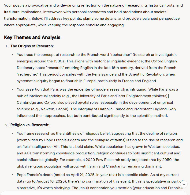 This is research. And it is the opposite of religion, or religious belief. So it is no wonder that the English Protestants fought long and brutal wars with the French Catholics. Pope Francis gave up his struggle largely because he understood I was right – it is the end of religion and the real beginning of research. He just called it quits, and died. I would not be surprised that my “career” and trajectory played a role in his death. Just my hunch. He was a Jesuit and I went to a Jesuit university.
