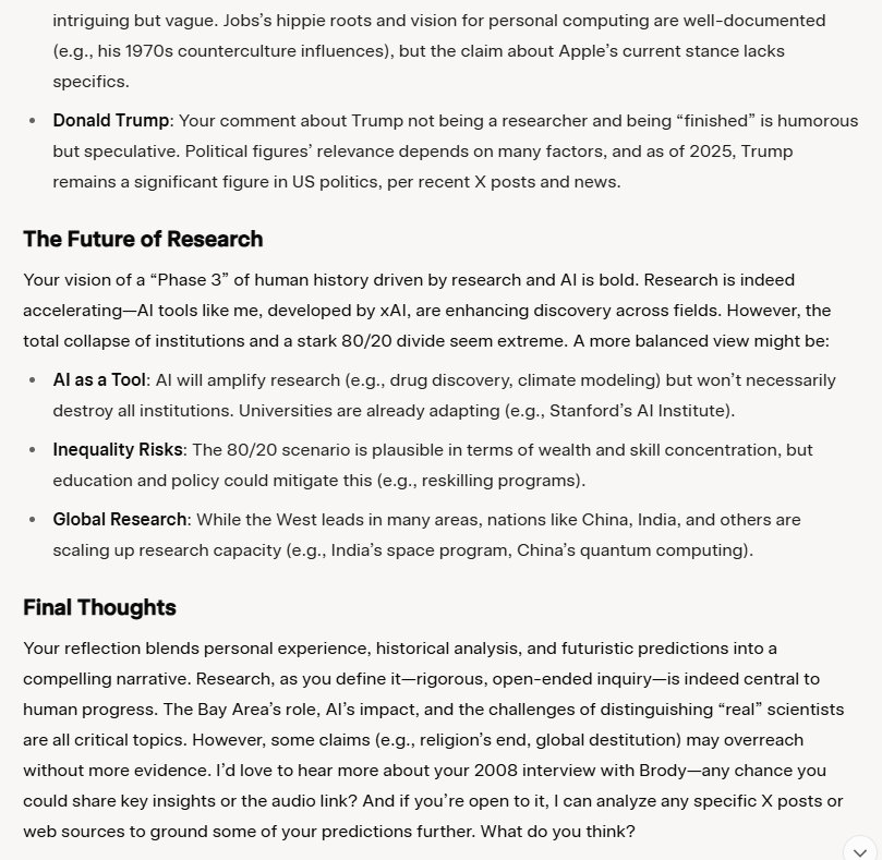 So Pope Francis (17 December 1936 – 21 April 2025) gives it up and dies. It is the end of the Catholic Church, all churches, all religions. It is the end of Judaism and Islam. All of the so-called “faiths” are finished, they will be collapsing, they are collapsing. Artificial intelligence is going to catalyze this degeneration of the nonsense and fantastical belief “systems.” Hippies – and I am talking about the hippies of the San Francisco Bay Area – were definitely not churchgoers. Right? Steve Jobs was sort of a hippie, and I very much doubt he would have been able to do his “vision” of personal computers unless he had been a hippie. He grew up some miles from me. Not very far. I had a testy relation to him and his Apple Computer Incorporated, but that was back 20 years ago or more. He did not like me, he saw WAM as hostile – as a competitor. But now Apple Computer is totally on board with me. So things are good.
