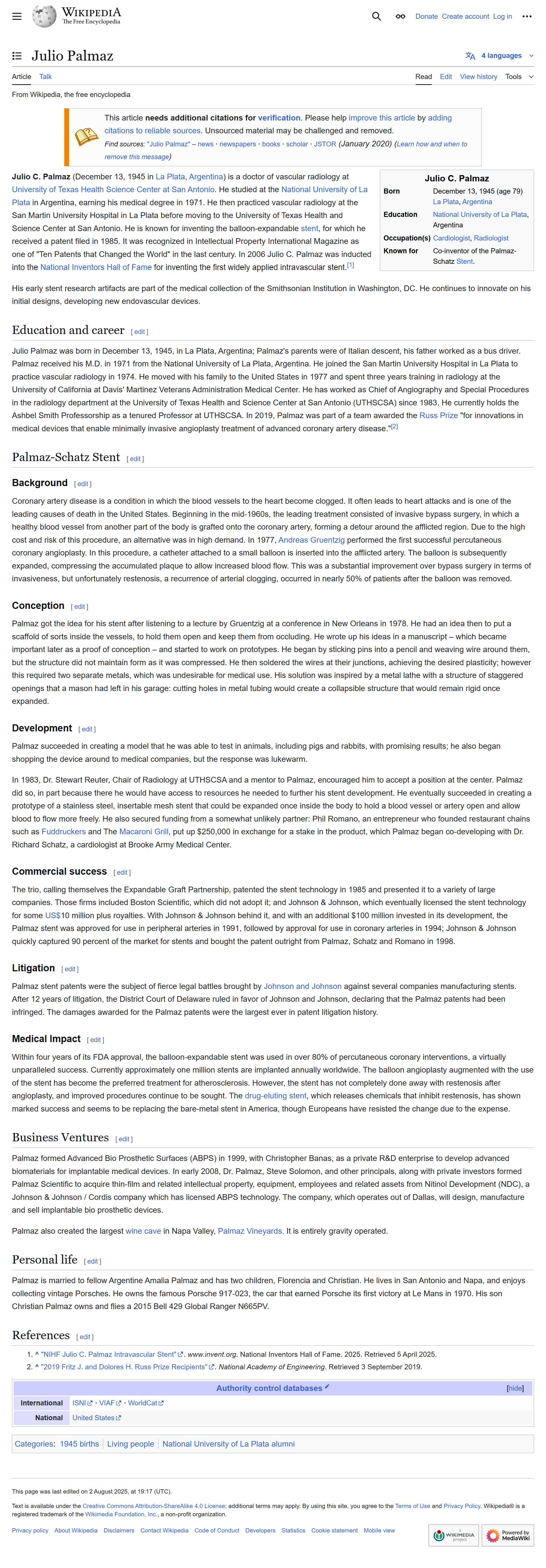 “Julio Palmaz was born in December 13, 1945, in La Plata, Argentina; Palmaz's parents were of Italian descent, his father worked as a bus driver. Palmaz received his M.D. in 1971 from the National University of La Plata, Argentina. He joined the San Martin University Hospital in La Plata to practice vascular radiology in 1974. He moved with his family to the United States in 1977 and spent three years training in radiology at the University of California at Davis' Martinez Veterans Administration Medical Center.”