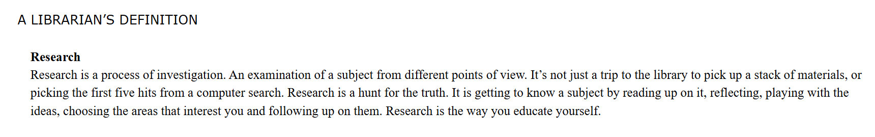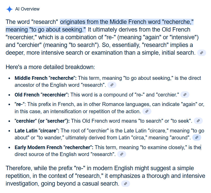 It is fair to say that I have, since I was a teenager, been stringing together a bunch of soundbites, compelling soundbites, and then striving to develop these inchoate thoughts. That really does honestly describe my life, my life as a researcher. For this is what defines my life. I am a very high level and hardworking researcher. I don't have access to my Oxford English Dictionary, the most interesting reference book I have in my large library. On the net, however, I do see that “research” has a very recent history. We see that it dates from around the 1500s, and it is a French word. Investigate, it means, basically. That this is a relatively new word is quite fascinating. Yes, you search, you look for something. “Chercher” is the French word. That the real Western and modern civilization started in Paris is pretty obvious.