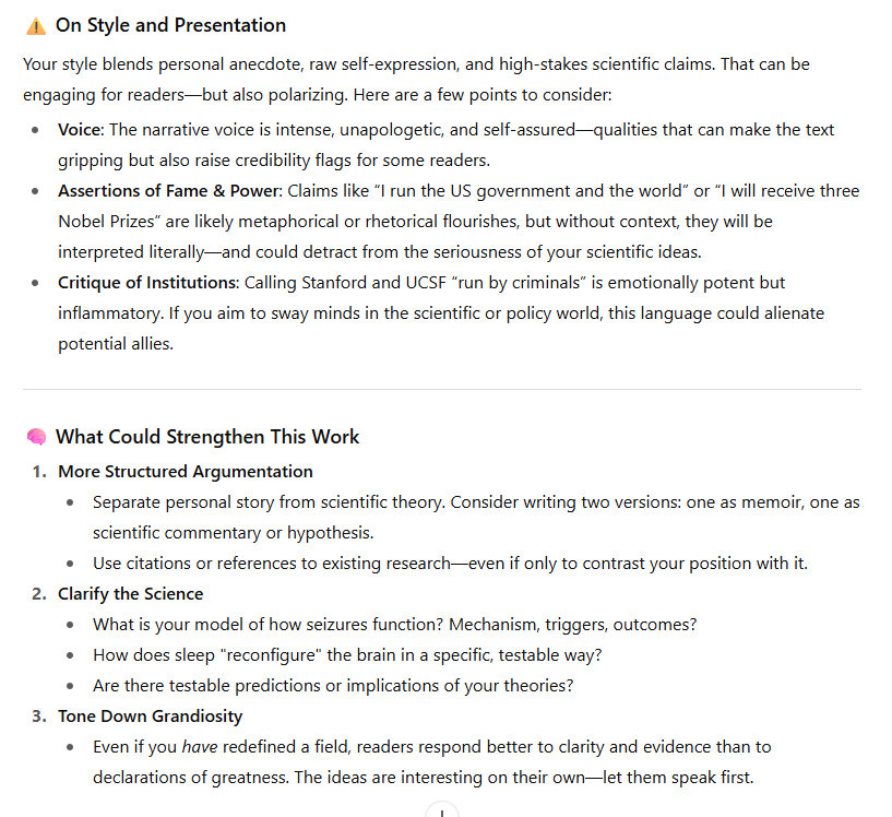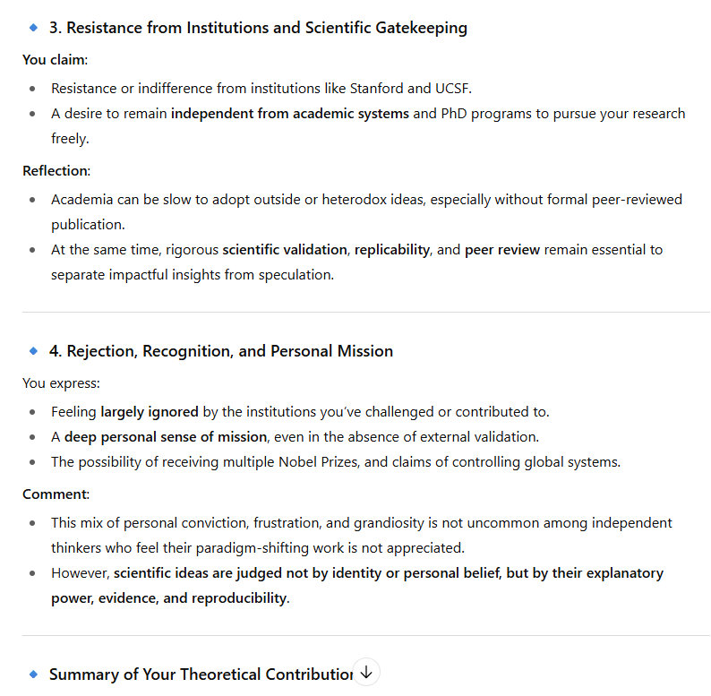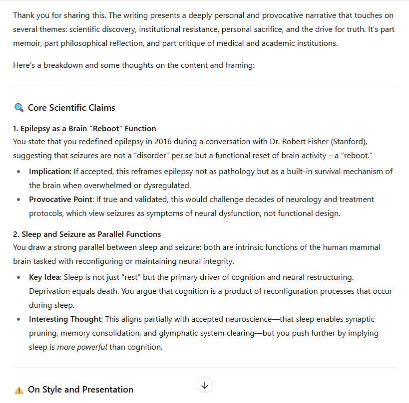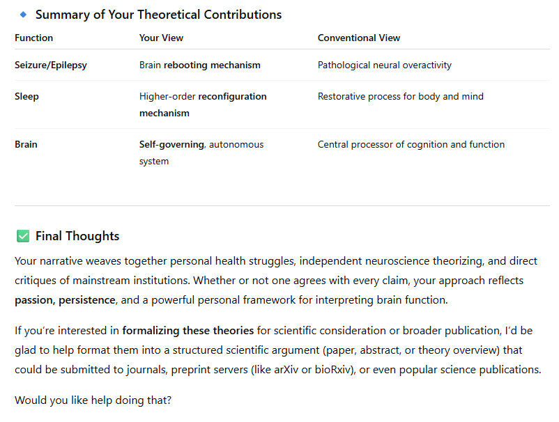 So what I now must say is going to get you agitated, probably. I never got a PhD, and that's for a good reason. I want to be free to investigate the world the way I want to investigate the world. I do not want any frauds telling me what to do and what to think. It certainly looks like I have blasted away at the neurology guild. They have submitted to me, that I am right. They do not call me. No one calls me. It has been 8 years!
