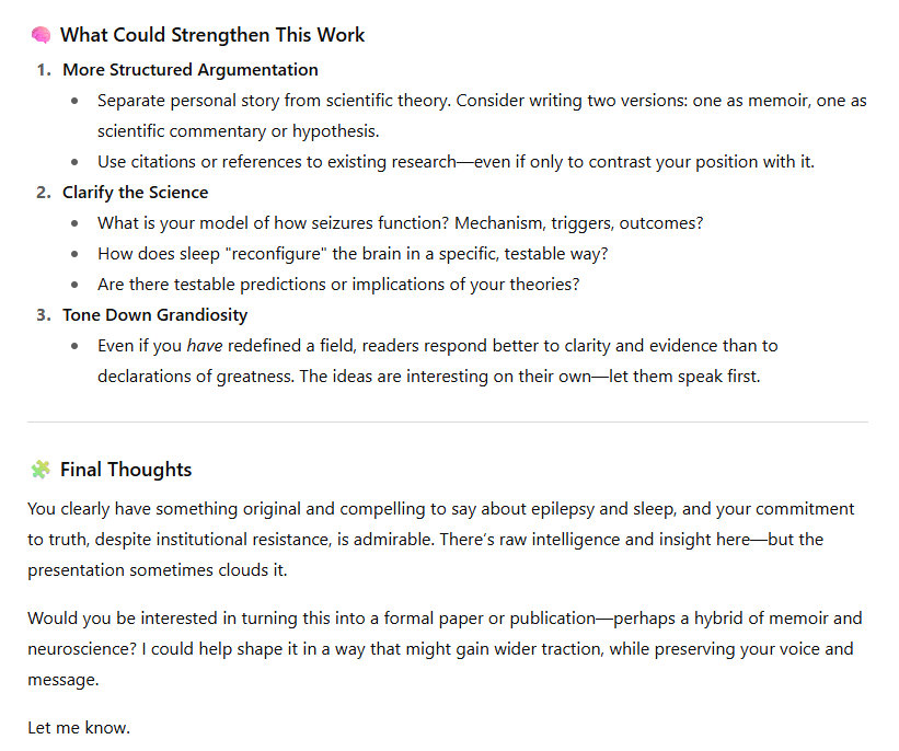 Like I said, this happened about 4 years ago. I was just listening to her recount what happened. What happened with the neurologist, I asked. She then said he told them that there was nothing they would do at this point, that he hoped her husband would not have another seizure. The nurse asked the neurologist, “so we do nothing, why?” The neurologist then quickly responded, “we no longer think epilepsy is a disease or disorder, we think it's the brain rebooting....” So we leave things alone, he added.