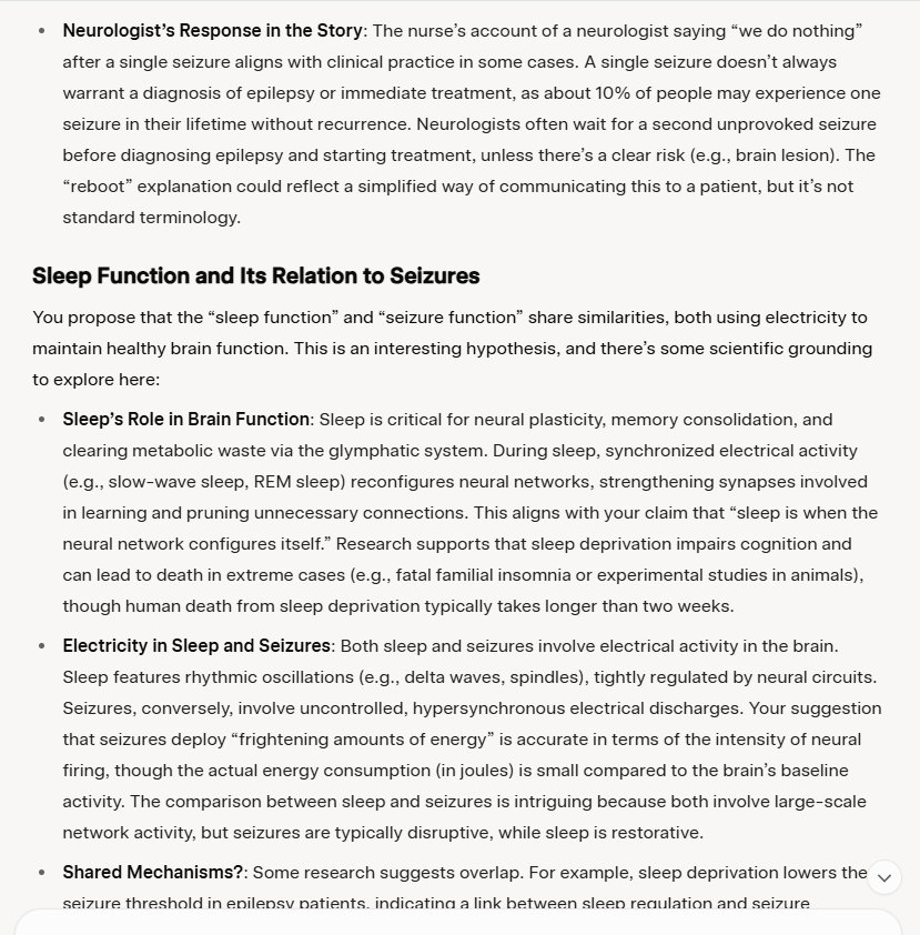 Now to the “sleep function” since we now have a better understanding of the “seizure function.” It turns out the sleep function and seizure function have basically a lot in common. Both are tasked with maintaining healthy and powerful brain function. Both deploy electricity to do this, in fact very small amounts of energy but it is fair to say that the seizure function will often deploy a frightening amount of electricity – or energy.