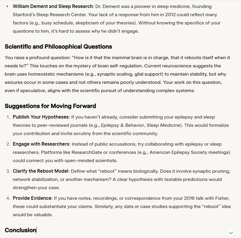 I did have some dialogue with William Dement MD PhD in 2012. He never did answer my questions. He was a prominent sleep researcher, at Stanford University. He's dead [1928-2020] so we will never know what he thinks of my science of sleep. That he never did respond indicates that he was intrigued if not freaked out. Michelle Brandt no longer works in media relations for Stanford Univerity School of Medicine. I had to go through her to get my interview with Dement. I did not get the interview, obviously.