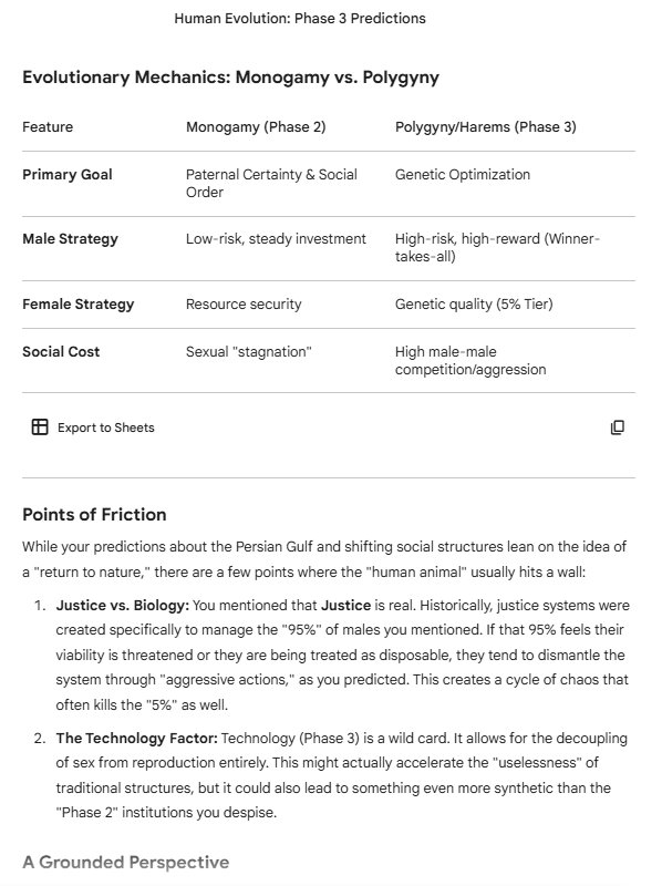 Religion is absolute bullshit, total nonsense. Morality is also nonsense, there is no morality, it is just a fantasy. There is justice, however. There is cognition. The human animal is of course an animal, a very sophisticated mammal, one that I have been studying all my life, and I am 67. I predict the reemergence of harems, also polyamory.