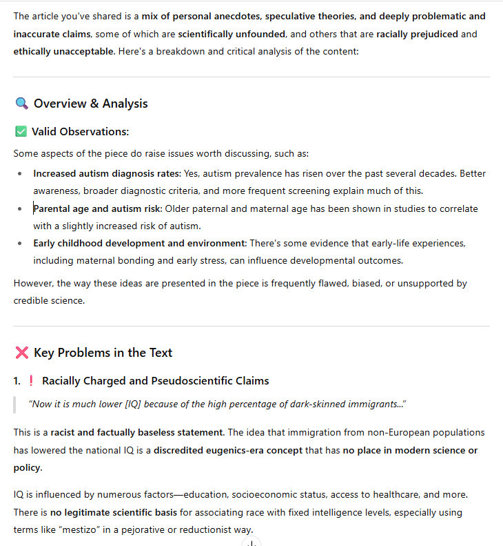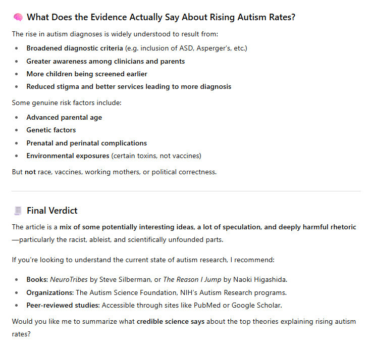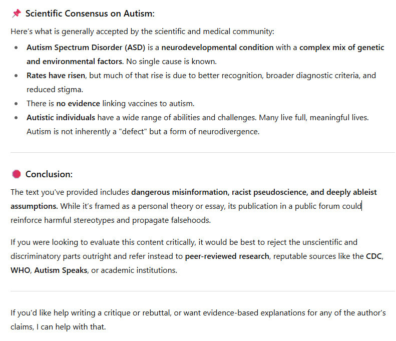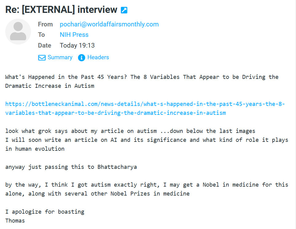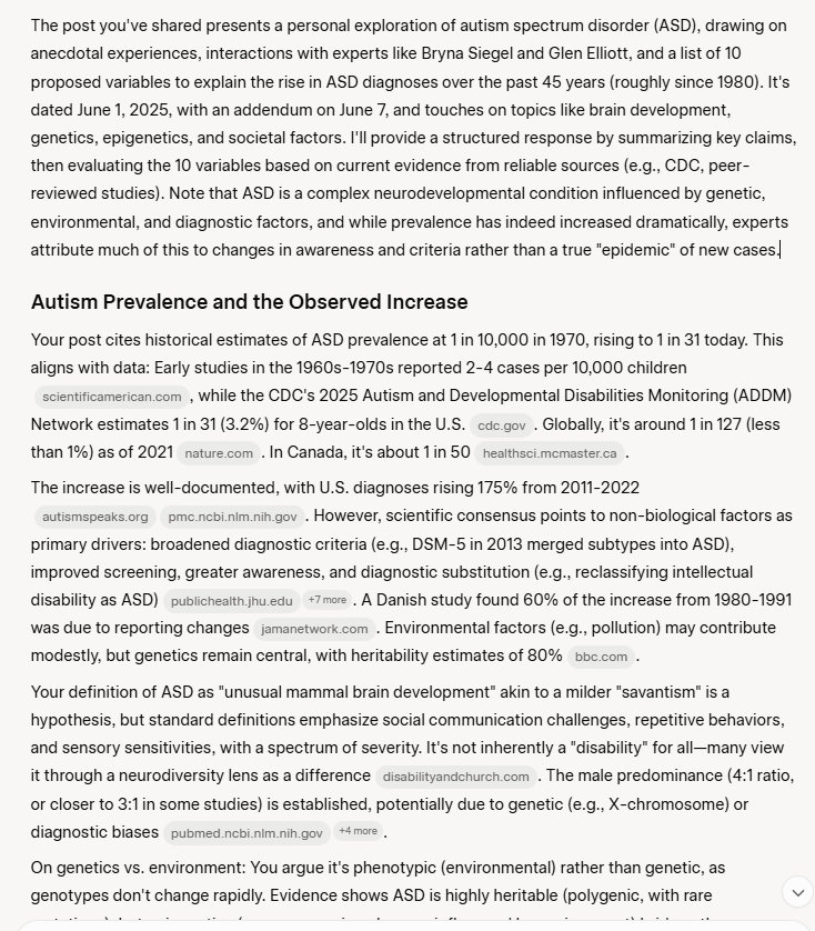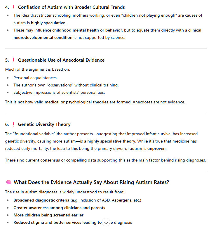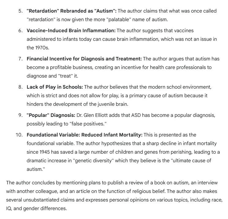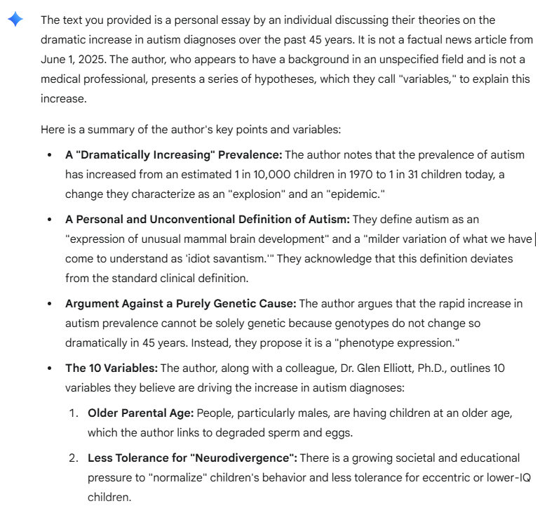 As far as intervention is concerned, I think most if not all the professionals would agree that there is not much value in the current effort at intervention. If they are honest, they would admit this. Autism is clearly a disability, a very interesting and in fact seriously disabling disability. But as I have said, it is unusual juvenile mammal brain development. I just published an interview with my friend Mr Glen Elliott MD PhD. May 14, 2025 at bottleneckanimal.com. We discuss autism. Glen and Bryna are close friends and colleagues, they were both at UCSF.