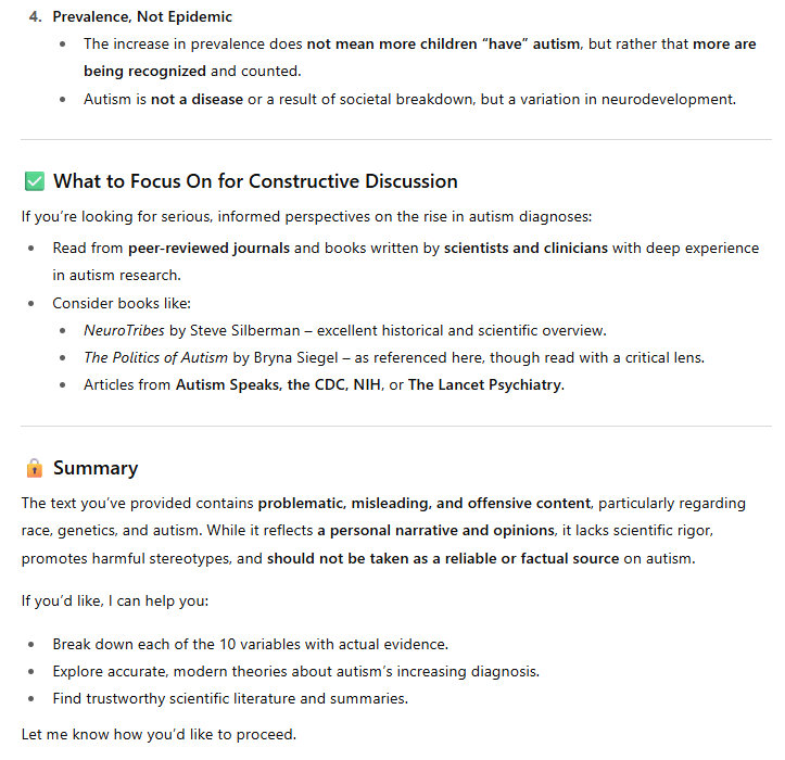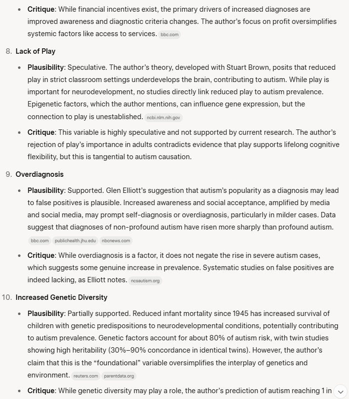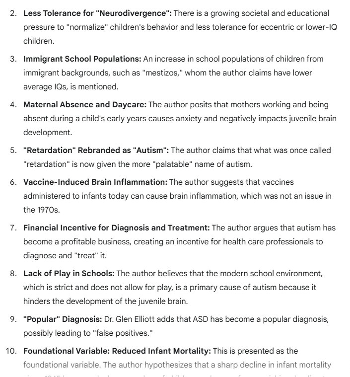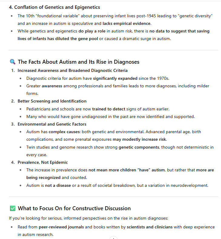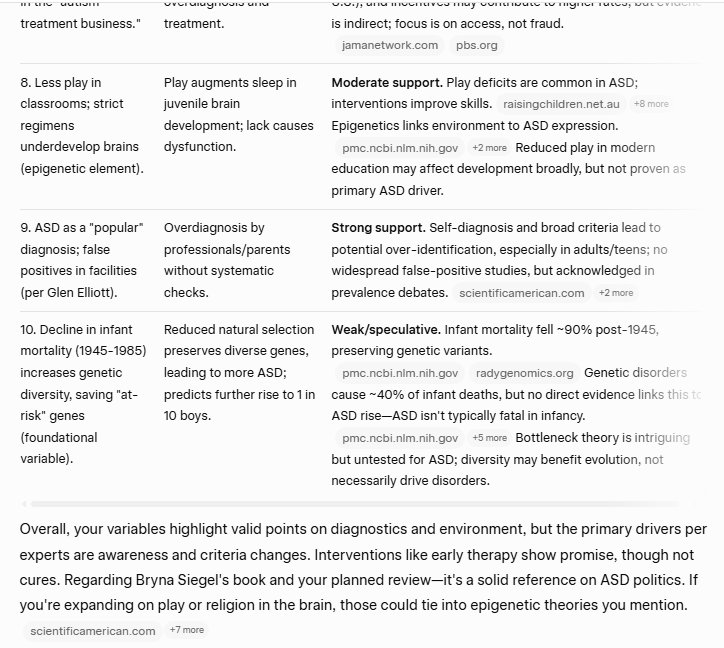 10+ actually, I am adding a 10th variable – but this is the foundational variable. The 9 variables arise from this foundational variable. I will have to closely examine the data, but it seems pretty obvious that starting around 1945 or so the number of infants dying at childbirth and immediately following childbirth began to fall pretty sharply. So let's call it 40 years – from 1945 to 1985 – that we have reduced the death rate of infants. Up until age 5 or so. This means we are saving huge numbers of children – and genes – from perishing. Natural forces are not taking them out of the gene pool. What I am arguing here is that genetic diversity has been increasing dramatically since 1945. This is the ultimate cause of autism, I believe. In fact, based on my theory here, I predict that autism will continue to increase in prevalence, indeed it may even accelerate quite a bit. In another 25 years there will be perhaps as many as 1 out of 10 boys with autism. This is genetic diversity, and in some respects it is desirable. It precedes the bottleneck, and the bottleneck is when genetic diversity is cut back sharply. Put simply, the build out of genetic diversity is very strong, and goes on for a long time; but at some point it cannot continue and a bottleneck then sharply reduces this explosion of genetic diversity. I have published down below my text messages with Glen Elliott MD PhD. He had asked me what the 10th was, and so I answered him.]
