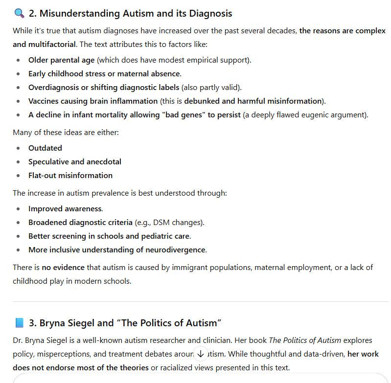Back 7 years ago, in 2018, Oxford University Press sent me [unsolicited] a review copy of a book they just published on autism. The Politics of Autism by Ms Bryna Siegel, PhD. She worked at UCSF with children, she's a developmental psychologist. She's retired now. She lives in the San Francisco Bay Area, probably in San Francisco. I asked Oxford University Press to put me in touch with her, and they did. I called her, and she agreed to meet, this was 2018. I took along my oldest son, Christophe. We spent several hours with Bryna discussing her book and autism. Ms Siegel is very frank and a meticulous researcher. She clearly has made a tremendous effort to put together all the important and relevant facts and information about autism in 274 pages. It is a little overwhelming, but we have to realize that she intends to be exhaustive. Her concern for the children she has seen is evident on every page. She is a mother, so she is not lacking empathy.