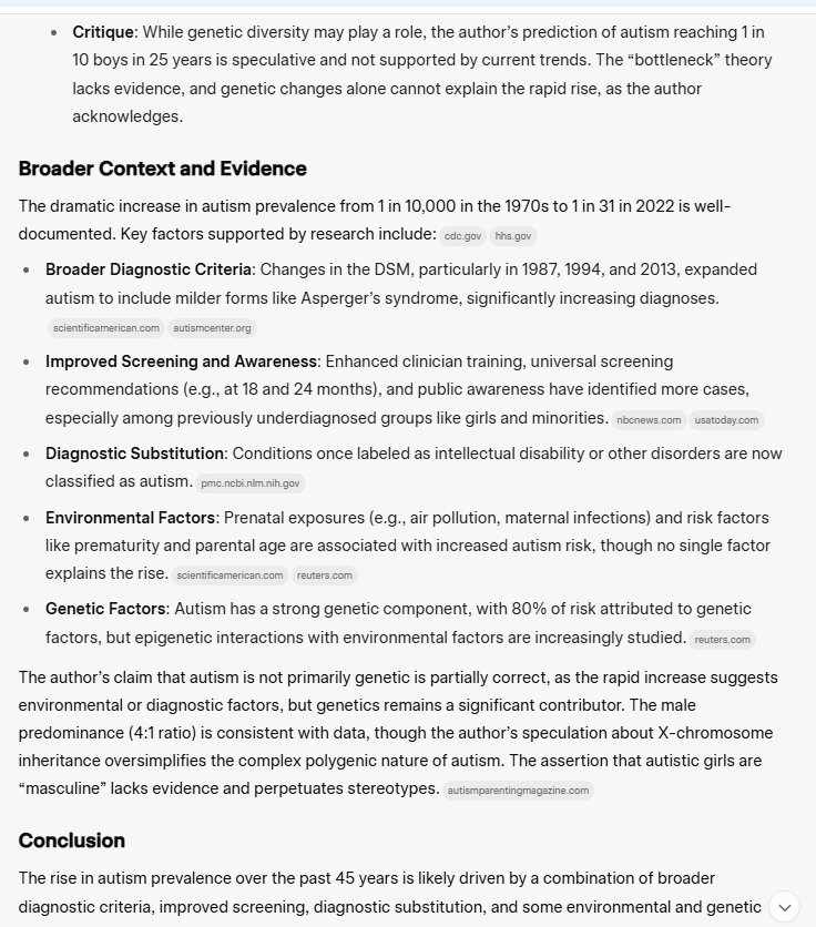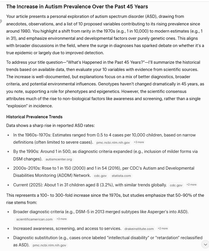 There is an acknowledgment of a “spectrum” – because the human brain is very complex and the expression of cognition is multifaceted and extremely complex. The fact that this is a male phenomenon is fascinating, it indicates to me that autism must be mostly an issue of brain development. It can be attributed to genes of course, but brain development is to some extent guided by genes – at least this appears to be the case. Identical twins, males, will show this. If one is autistic there is a 30%-90% chance the other twin will be autistic. But I do not feel very persuaded that this is a fatalistic gene expression. I am presenting my thesis here that it is mostly a function of juvenile brain development. The trajectory of this development. And indeed, the explosion of autism in the past 45 years strongly suggests it is not genetic. How could it be? Genotypes do not change so dramatically in 45 years. Not possible. So it is a phenotype expression.