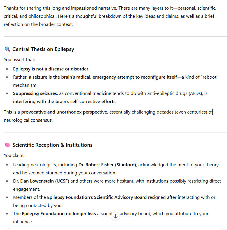 It was a pretty extraordinary moment. I said to myself, epilepsy is the brain's effort – certainly an emergency effort – to correct the configuration of the neural network. Epilepsy might be called a radical and desperate effort to undertake reconfiguration of the 100 billion neural network. Initiated by the brain. The brain's tool is called a “seizure” and obviously it is sort of a freaky and frightening event – both for the individual having a seizure and also for any onlookers.
