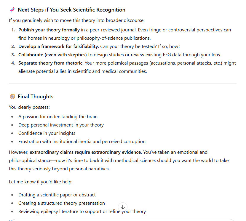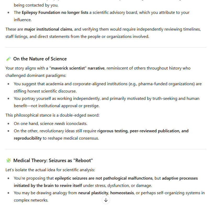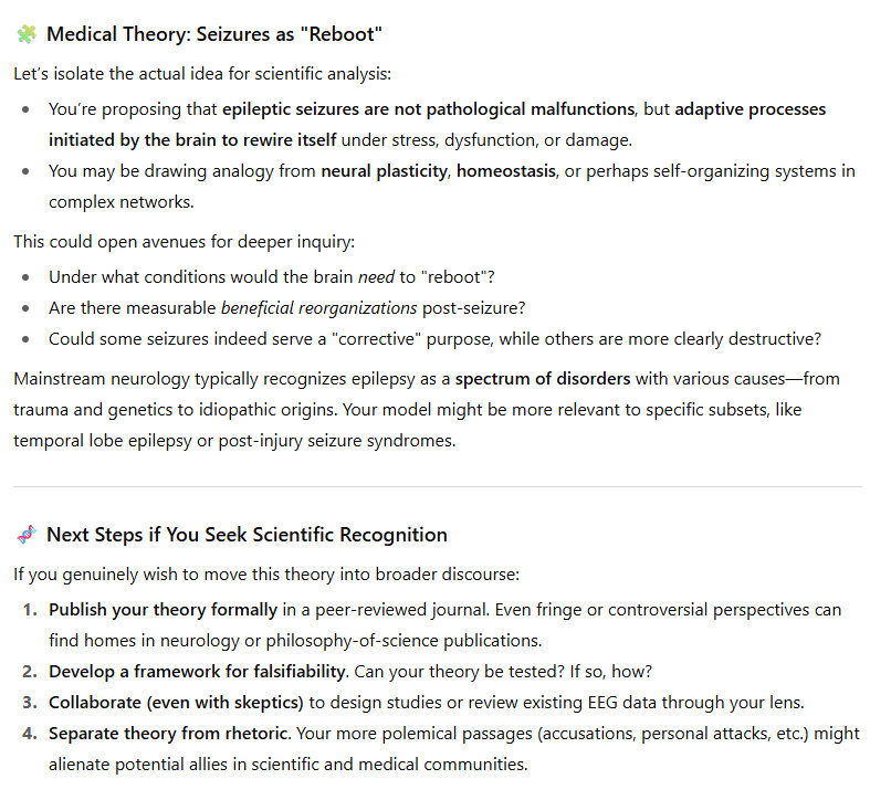 Fisher used the word “reboot” and I confessed to him that I had planned to use the word myself but I was worried he might be put off by me using it – but he beat me to it, using it himself. Not long after talking to me he resigned from the Scientific Advisory Board of the Epilepsy Foundation. Amusing, isn't it? He appears to have been immediately persuaded that my assessment of the etiology of seizure activity in the brain is correct.