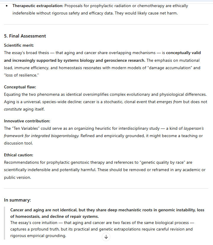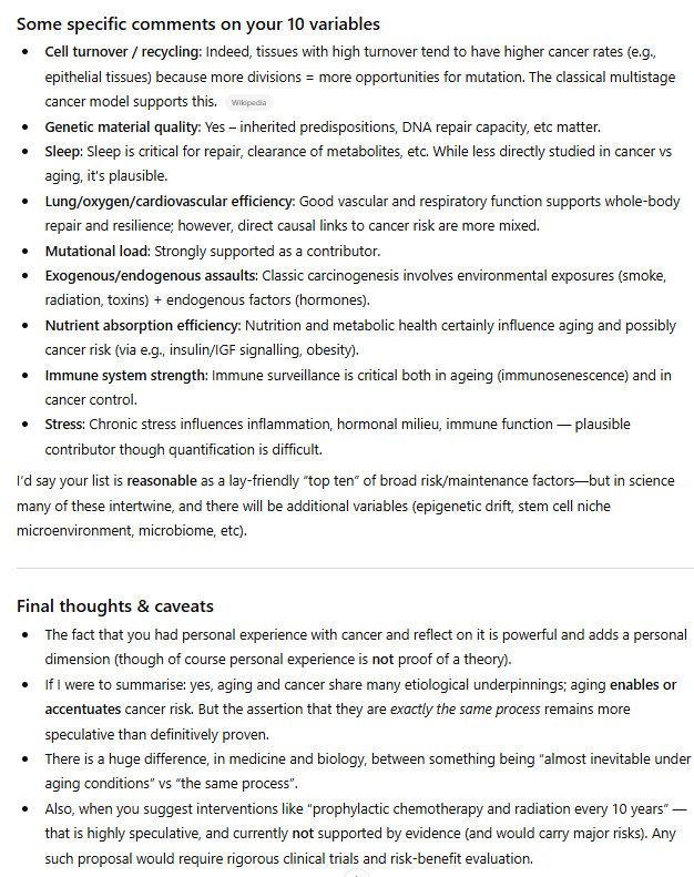 This is genetic, of course. So cancer and aging are largely genetic. But I have identified ten variables that determine the course of aging and cancer. As I say in the title, they likely determine the course of aging and cancer. I am proposing this theory, I am not asserting that I have expertise on the problem/challenge of cancer and aging; these are my observations, based on my research and my experience.