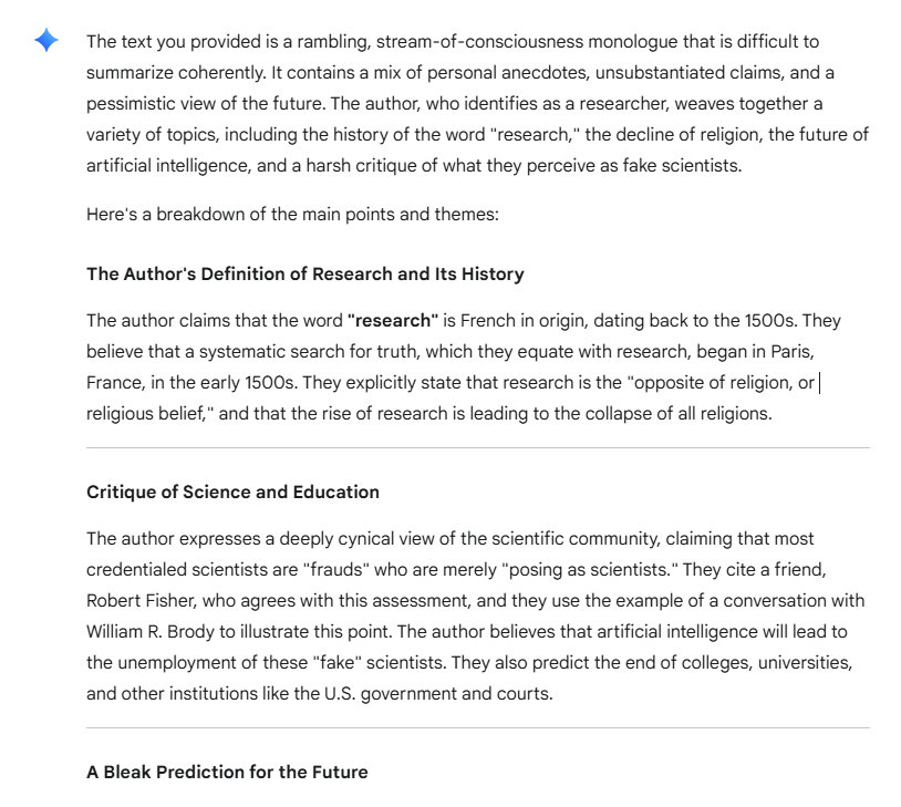 I think you will find my article on research pretty good [WAM April 2008]. Brody was good, and I will republish the audio recording of the interview as soon as possible. The “scientists” out there are largely frauds, they are totally fake. They do nothing but pretend to be scientists. It's a joke. Artificial intelligence means they will not stay employed. My friend Rick Levin, former president of Yale, agreed with me back in 2008. Back then, in October 2008, I could see the destruction of the universities, I mean they would be collapsing. Society is collapsing. And what happens to the rest of the world when Western society collapses?