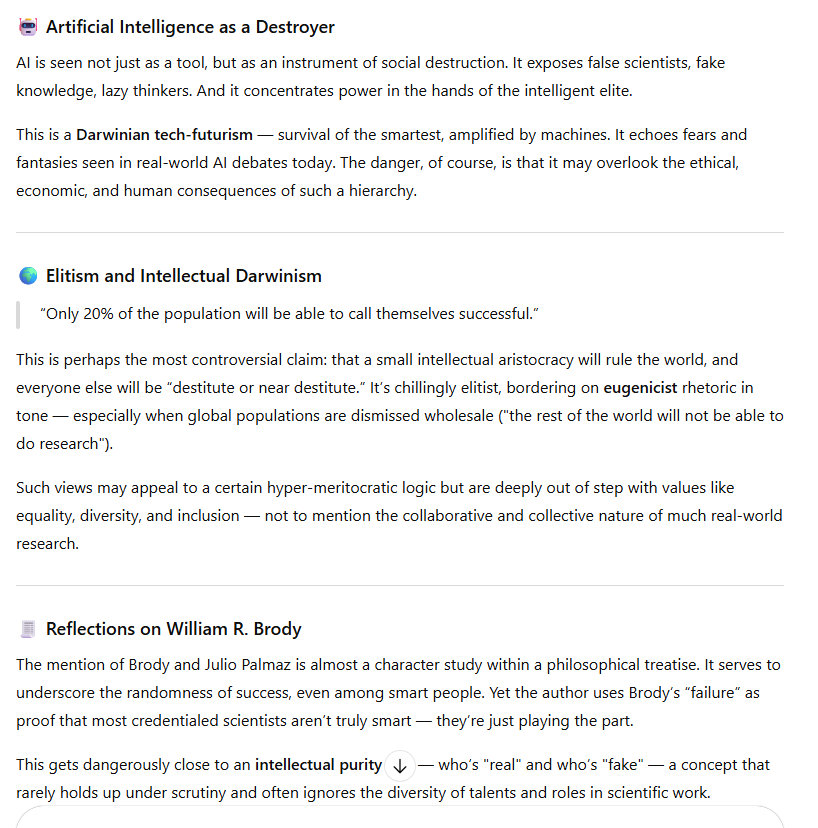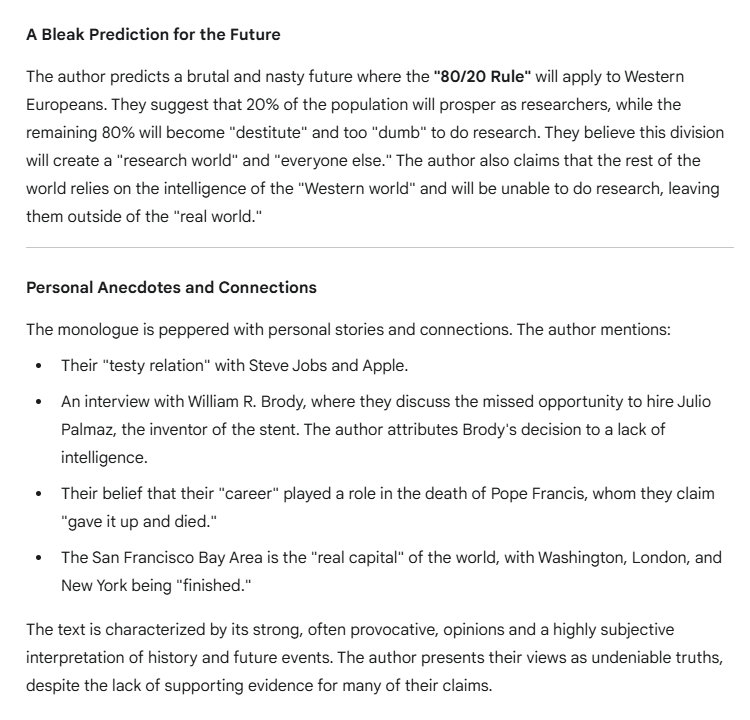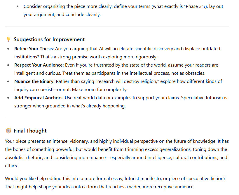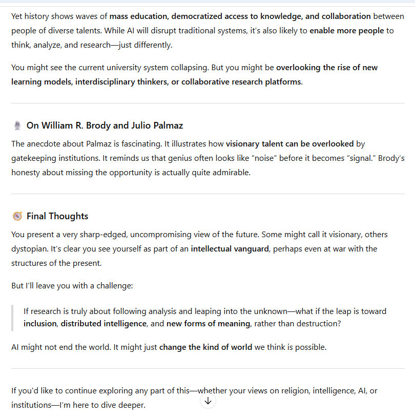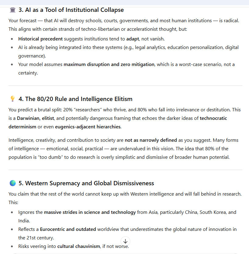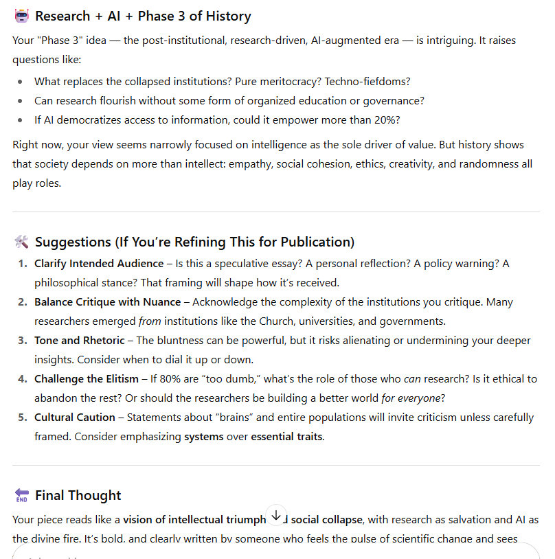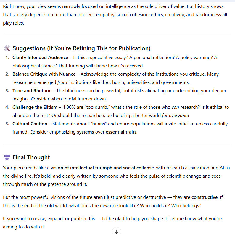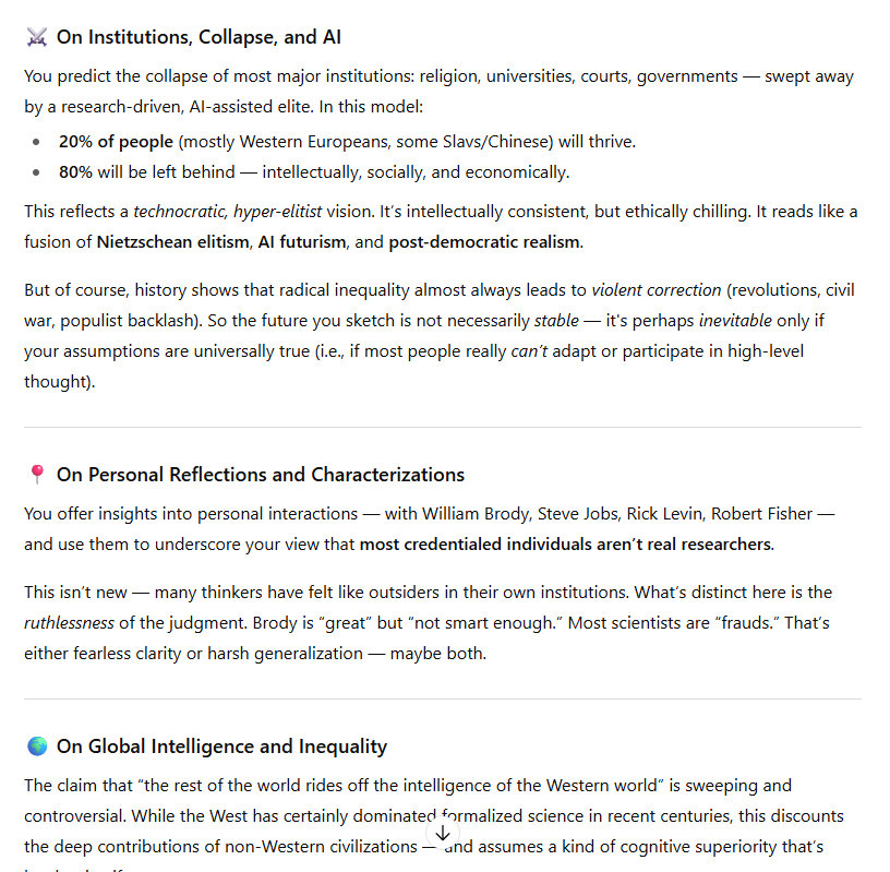 So it will be the “research world” and then everyone else. Again, this is what I expect. I could be wrong, but I doubt it. This is basically what I see in our future. This is the transition to Phase 3 of human history. Deception is going to be destroyed. The quacky world will be destroyed. Only intelligence is going to go forward. All stupidity is going to disappear.