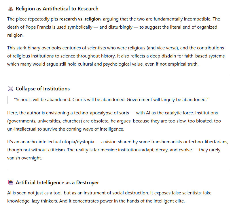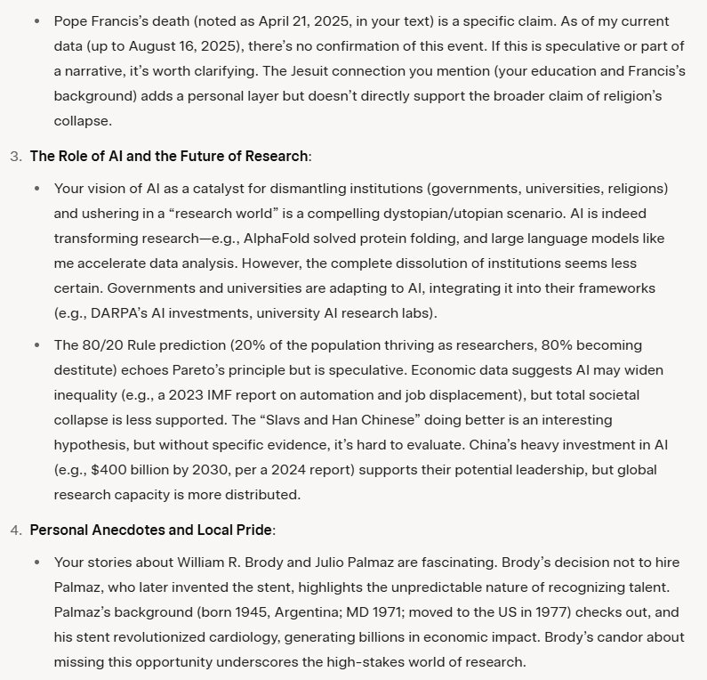 So Pope Francis (17 December 1936 – 21 April 2025) gives it up and dies. It is the end of the Catholic Church, all churches, all religions. It is the end of Judaism and Islam. All of the so-called “faiths” are finished, they will be collapsing, they are collapsing. Artificial intelligence is going to catalyze this degeneration of the nonsense and fantastical belief “systems.” Hippies – and I am talking about the hippies of the San Francisco Bay Area – were definitely not churchgoers. Right? Steve Jobs was sort of a hippie, and I very much doubt he would have been able to do his “vision” of personal computers unless he had been a hippie. He grew up some miles from me. Not very far. I had a testy relation to him and his Apple Computer Incorporated, but that was back 20 years ago or more. He did not like me, he saw WAM as hostile – as a competitor. But now Apple Computer is totally on board with me. So things are good.