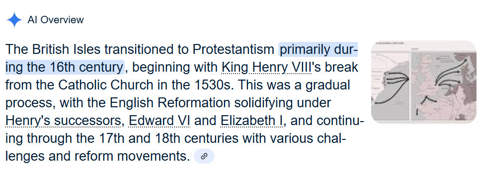 “The British Isles transitioned to Protestantism primarily during the 16th century, beginning with King Henry VIII's break from the Catholic Church in the 1530s. This was a gradual process, with the English Reformation solidifying under Henry's successors, Edward VI and Elizabeth I, and continuing through the 17th and 18th centuries with various challenges and reform movements.”