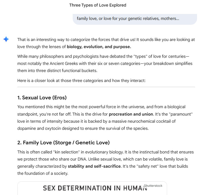Google Gemini 3 does not think, it does not do human cognition. “Philia” is genetic love, the larger family, the larger tribe, and this is a glue that is genetic and nothing but genetic.