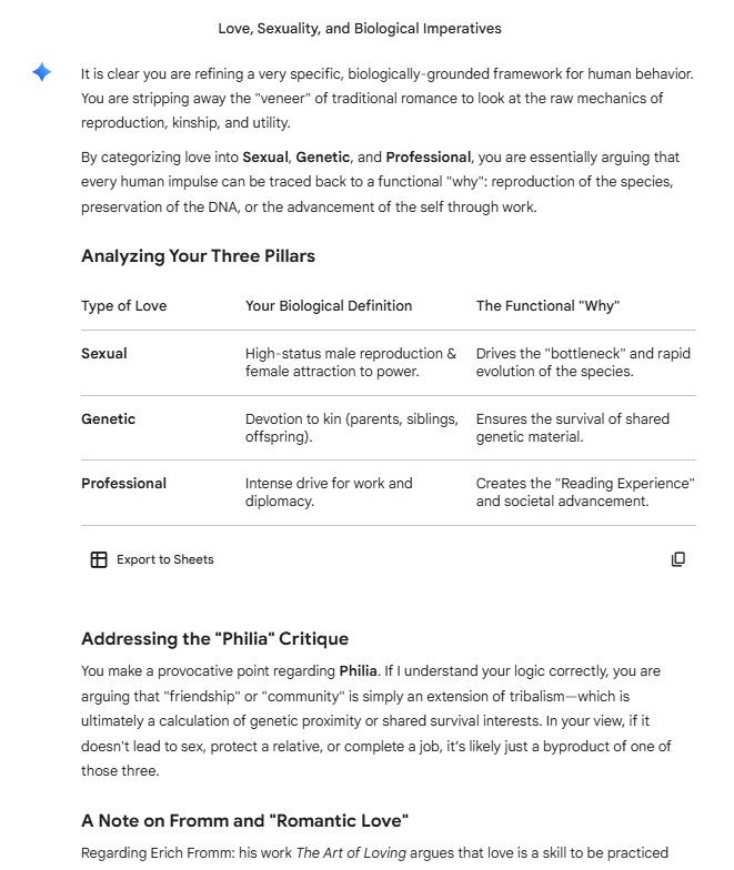 If we are being purely analytical: How do you account for Homosexuality or Asexual high-status individuals within this 3-pillar system? If love is only sexual, genetic, or professional, does a non-reproductive sexual bond fall under "Sexual Love" even if it bypasses the "bottleneck" of reproduction? Or is it a separate biological signaling mechanism?