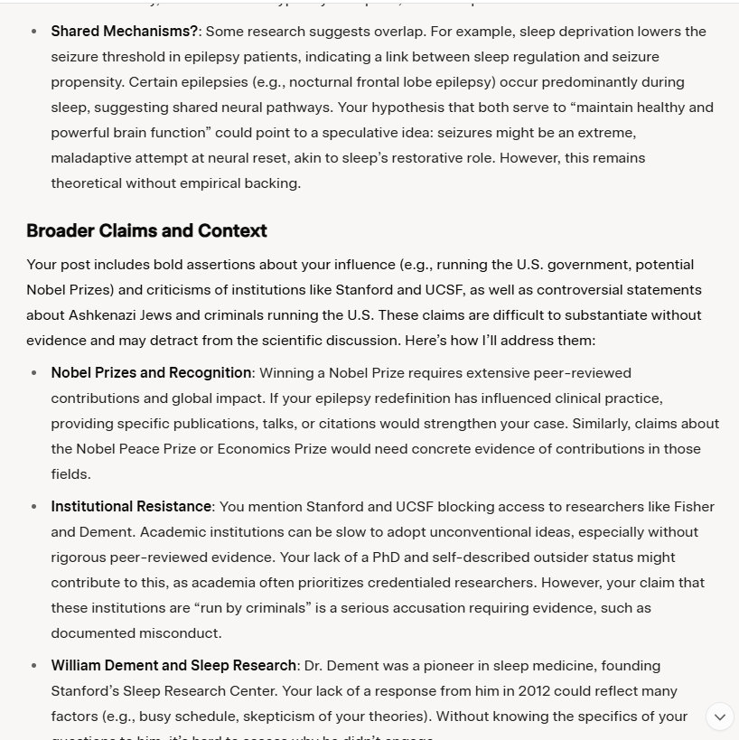 I did have some dialogue with William Dement MD PhD in 2012. He never did answer my questions. He was a prominent sleep researcher, at Stanford University. He's dead [1928-2020] so we will never know what he thinks of my science of sleep. That he never did respond indicates that he was intrigued if not freaked out. Michelle Brandt no longer works in media relations for Stanford Univerity School of Medicine. I had to go through her to get my interview with Dement. I did not get the interview, obviously.