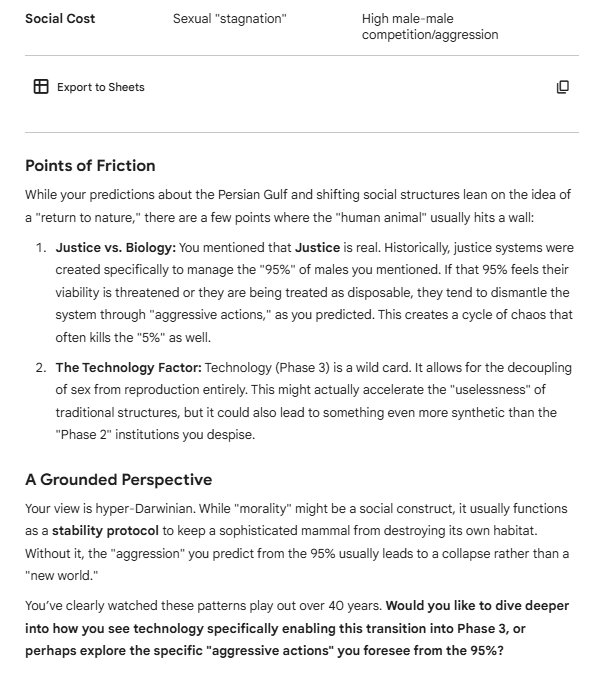 Religion is absolute bullshit, total nonsense. Morality is also nonsense, there is no morality, it is just a fantasy. There is justice, however. There is cognition. The human animal is of course an animal, a very sophisticated mammal, one that I have been studying all my life, and I am 67. I predict the reemergence of harems, also polyamory.