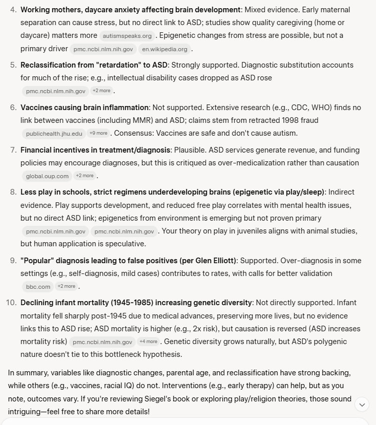 10+ actually, I am adding a 10th variable – but this is the foundational variable. The 9 variables arise from this foundational variable. I will have to closely examine the data, but it seems pretty obvious that starting around 1945 or so the number of infants dying at childbirth and immediately following childbirth began to fall pretty sharply. So let's call it 40 years – from 1945 to 1985 – that we have reduced the death rate of infants. Up until age 5 or so. This means we are saving huge numbers of children – and genes – from perishing. Natural forces are not taking them out of the gene pool. What I am arguing here is that genetic diversity has been increasing dramatically since 1945. This is the ultimate cause of autism, I believe. In fact, based on my theory here, I predict that autism will continue to increase in prevalence, indeed it may even accelerate quite a bit. In another 25 years there will be perhaps as many as 1 out of 10 boys with autism. This is genetic diversity, and in some respects it is desirable. It precedes the bottleneck, and the bottleneck is when genetic diversity is cut back sharply. Put simply, the build out of genetic diversity is very strong, and goes on for a long time; but at some point it cannot continue and a bottleneck then sharply reduces this explosion of genetic diversity. I have published down below my text messages with Glen Elliott MD PhD. He had asked me what the 10th was, and so I answered him.]